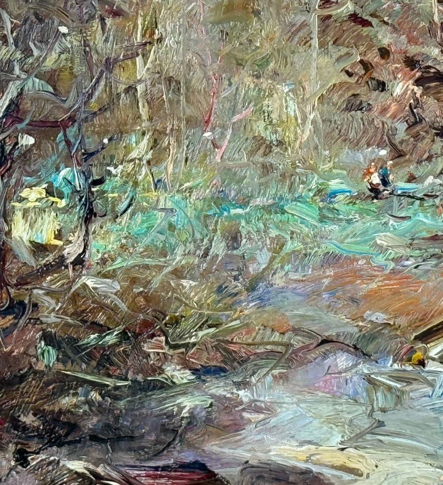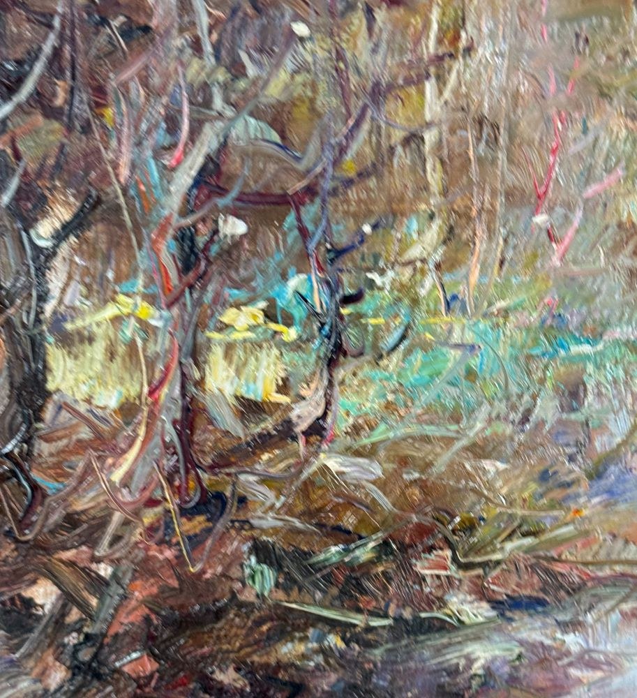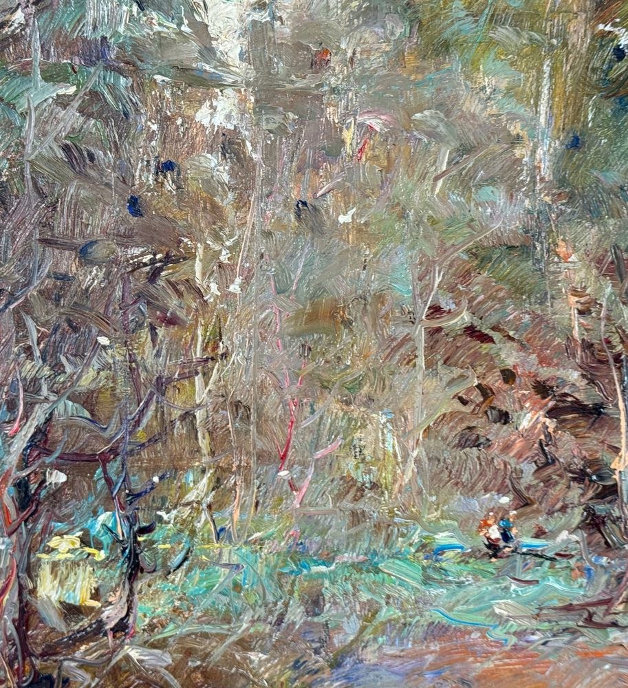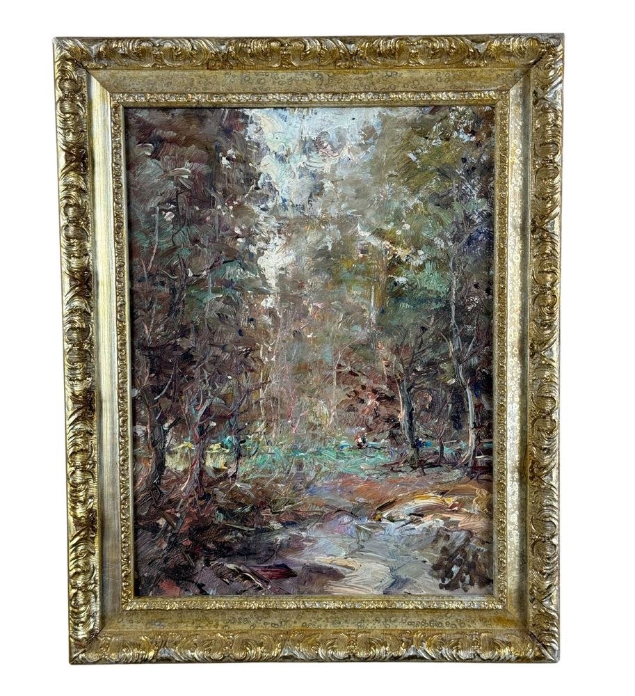 Oil painting on board, 20th-century Italian school, depicting a wooded landscape. Dimensions including the frame: 39x49 cm. Interior frame dimensions: 30x40 cm. By an anonymous artist. The piece is in good condition.
