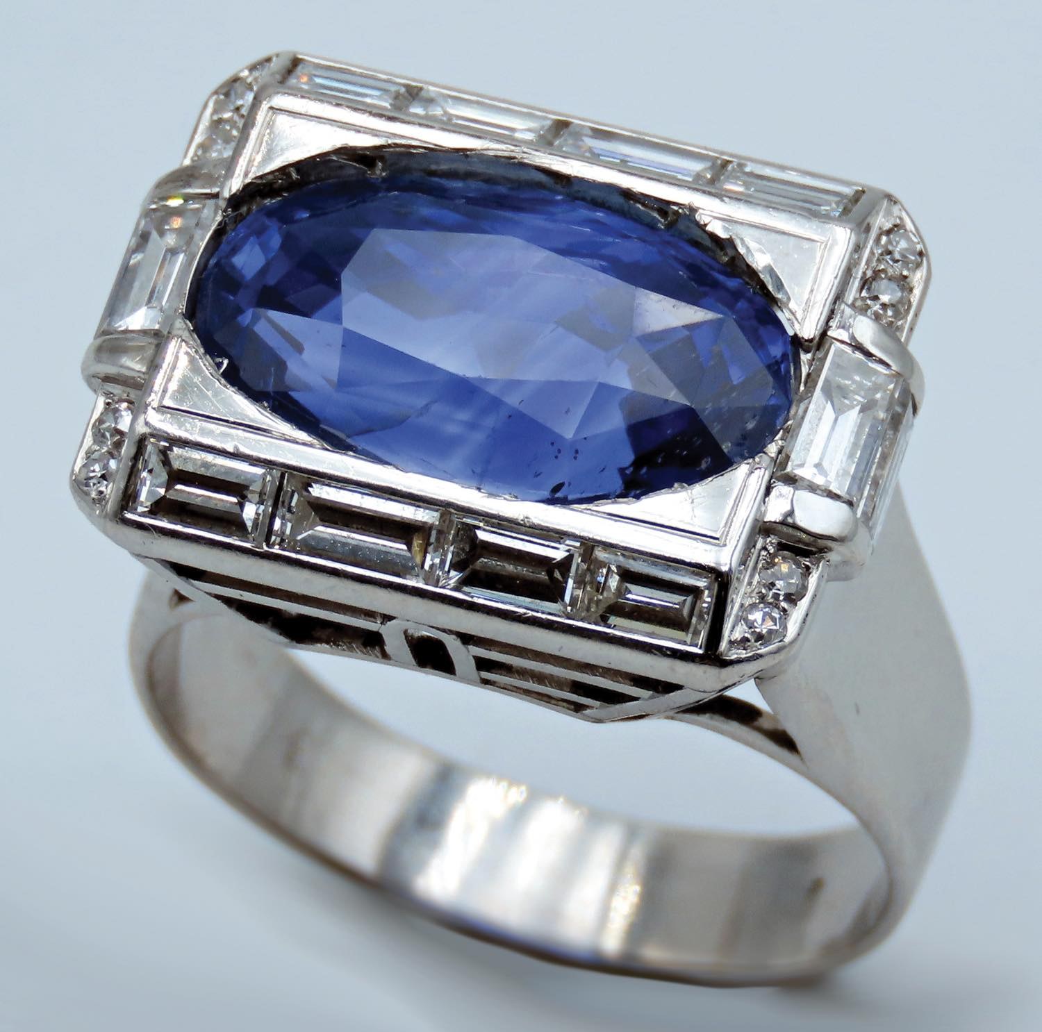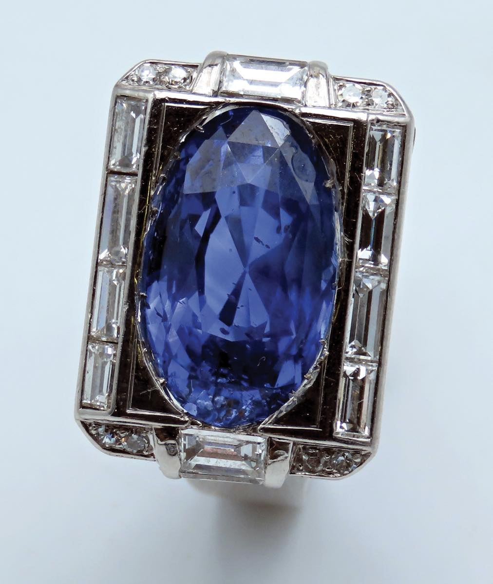 Anello in oro bianco con diamanti ct.1 circa e zaffiro centrale ct.11,35 certificato CISGEM n°30754 misura 20. gr.15,25