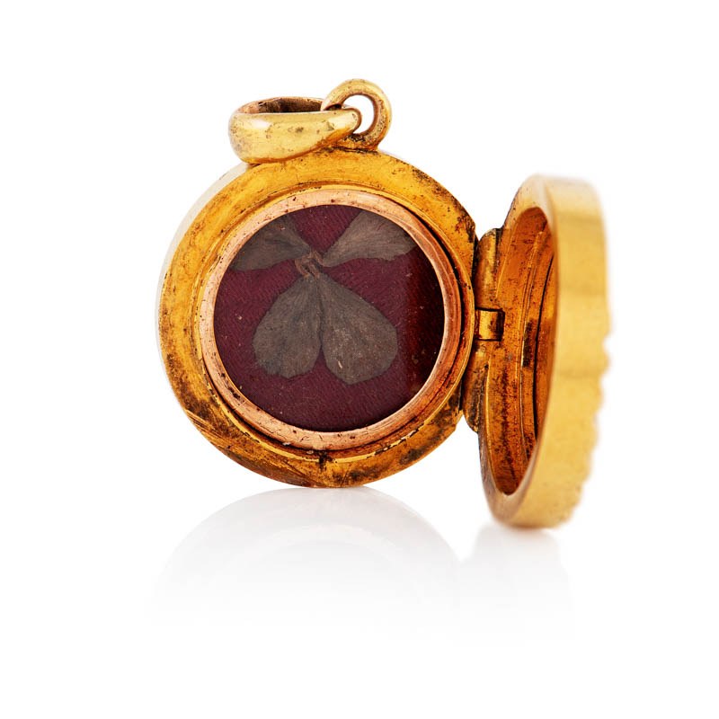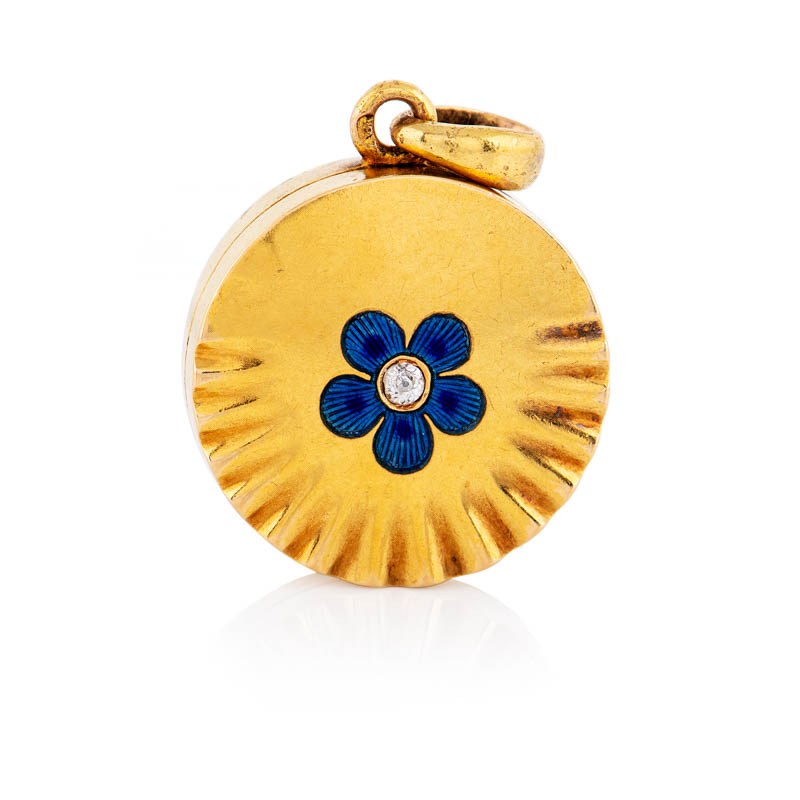 złoto pr. 0,750, emalia niebieska na giloszu, 1 szt. diament ~ 0,03 ct, wewnątrz szkło, masa: 7,71 g; wym.: 3 x 2 cm; stan zachowania: delikatnie porysowana oprawa