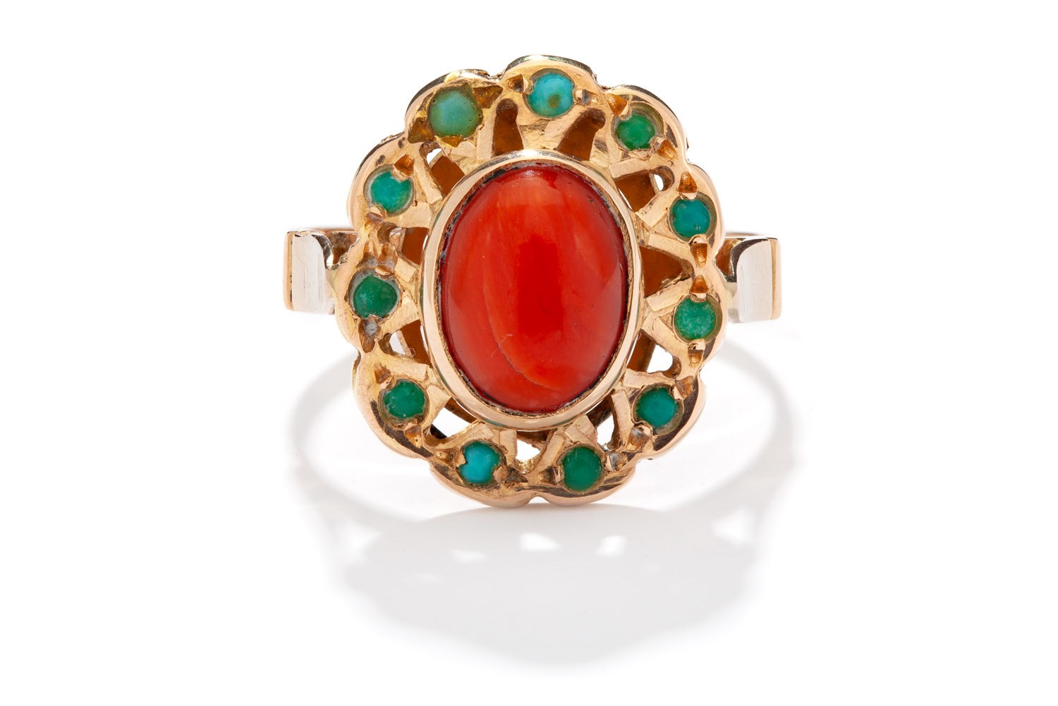 złoto pr. 0,750, 1 koral w szlifie kaboszon, 11 turkusów w szlifie kaboszon, masa: 4,39 g, rozmiar: 15,5*