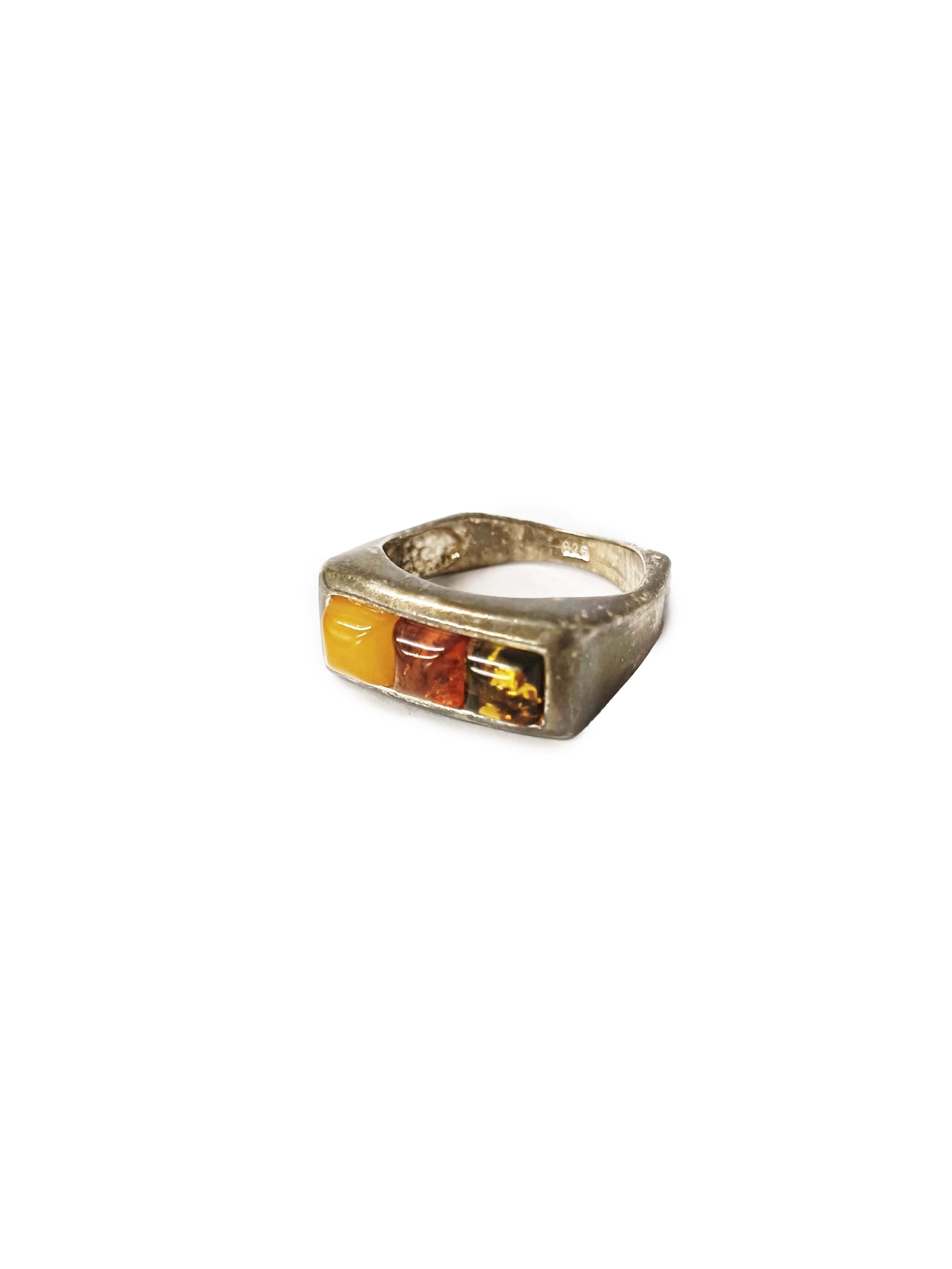 Pierścionek z bursztynu naturalnego w trzech różnych odcieniach. Srebro pr.925. Posiada przebarwienia na powierzchni.