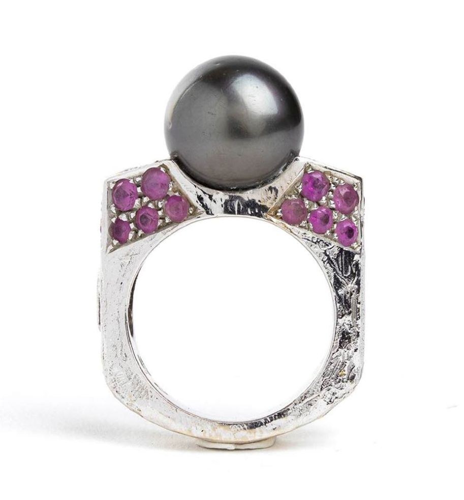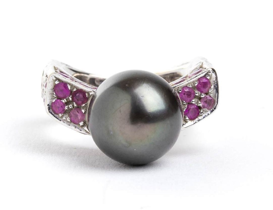 18k white gold, with Tahitian pearl and pavé set rubies ca. 1.30 ct. Signed TORRINI. Hallmarked "750 - 504 FI". Size US 7 1/2.