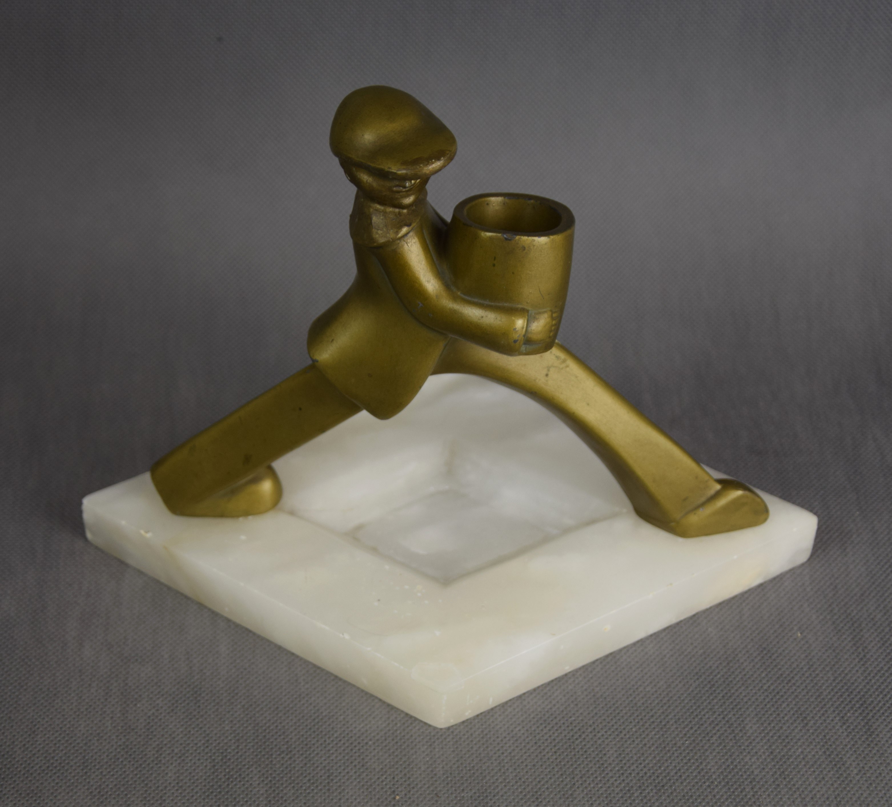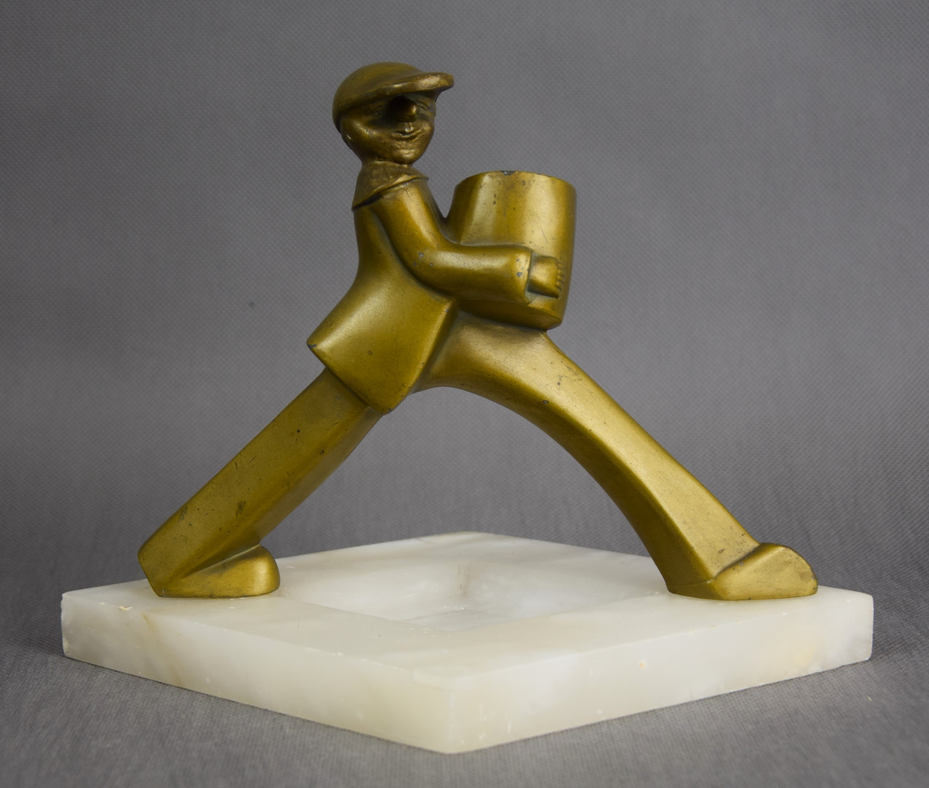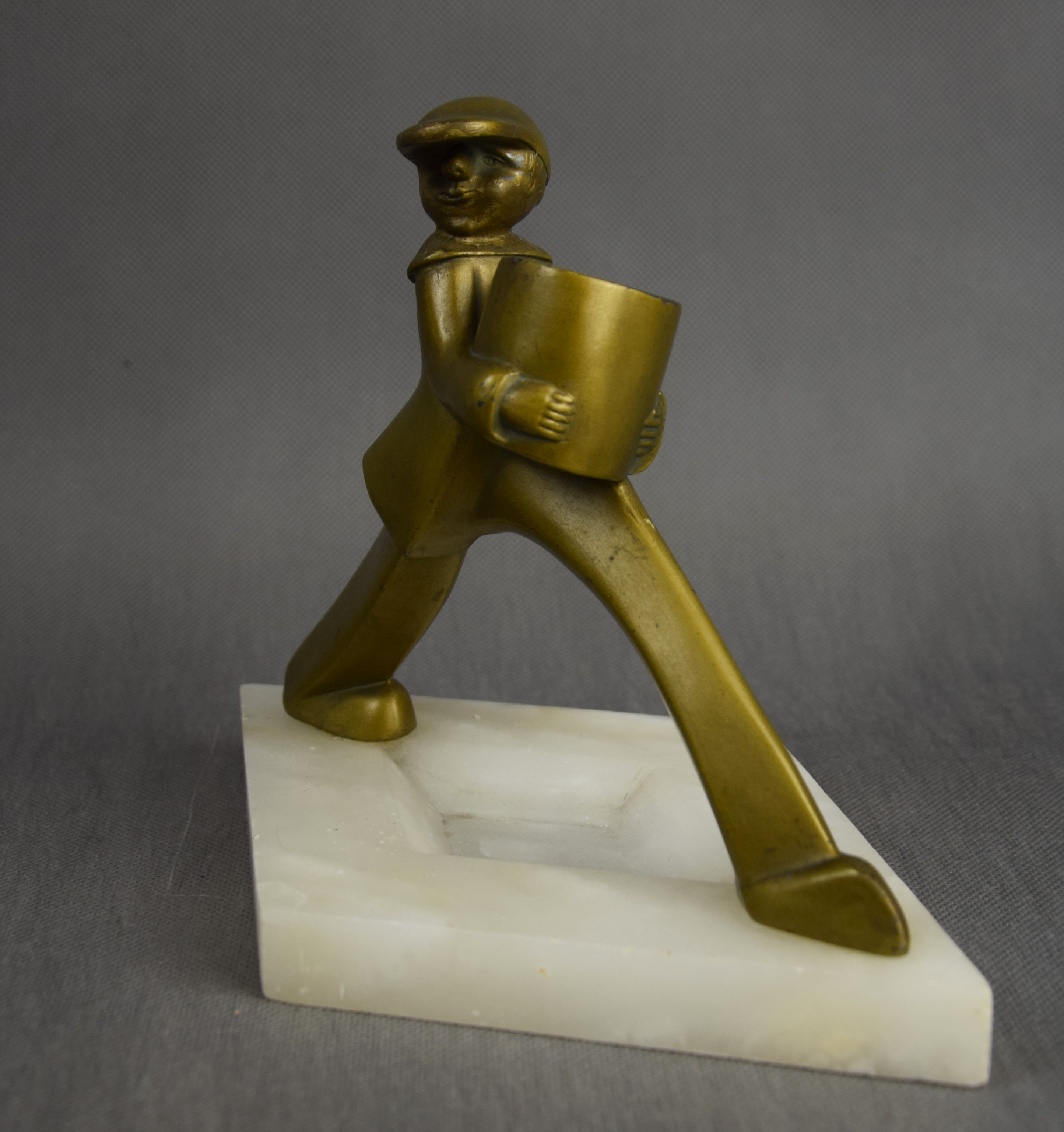 Popielnica w stylu Art Deco z figurą idącego chłopca w kaszkiecie.