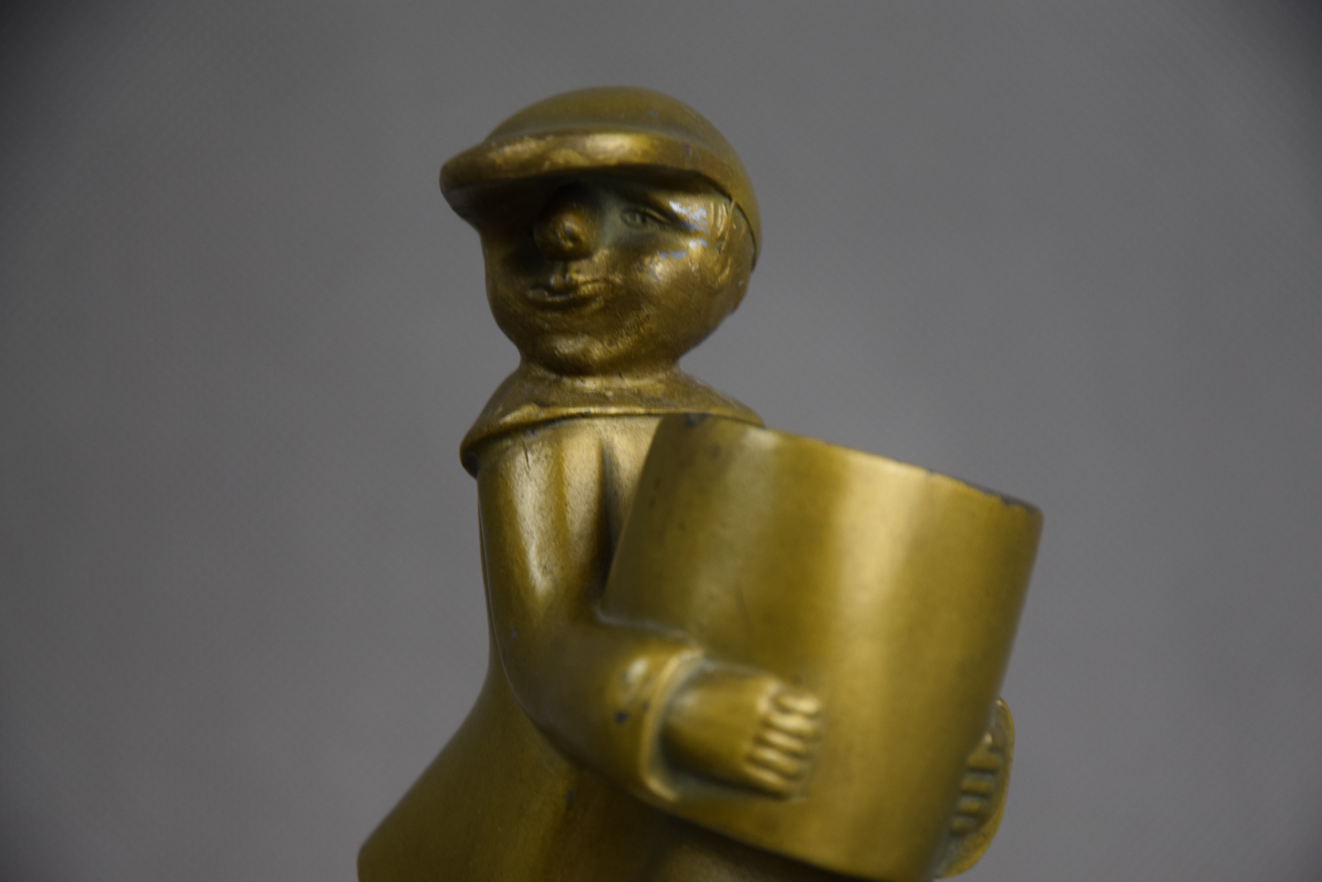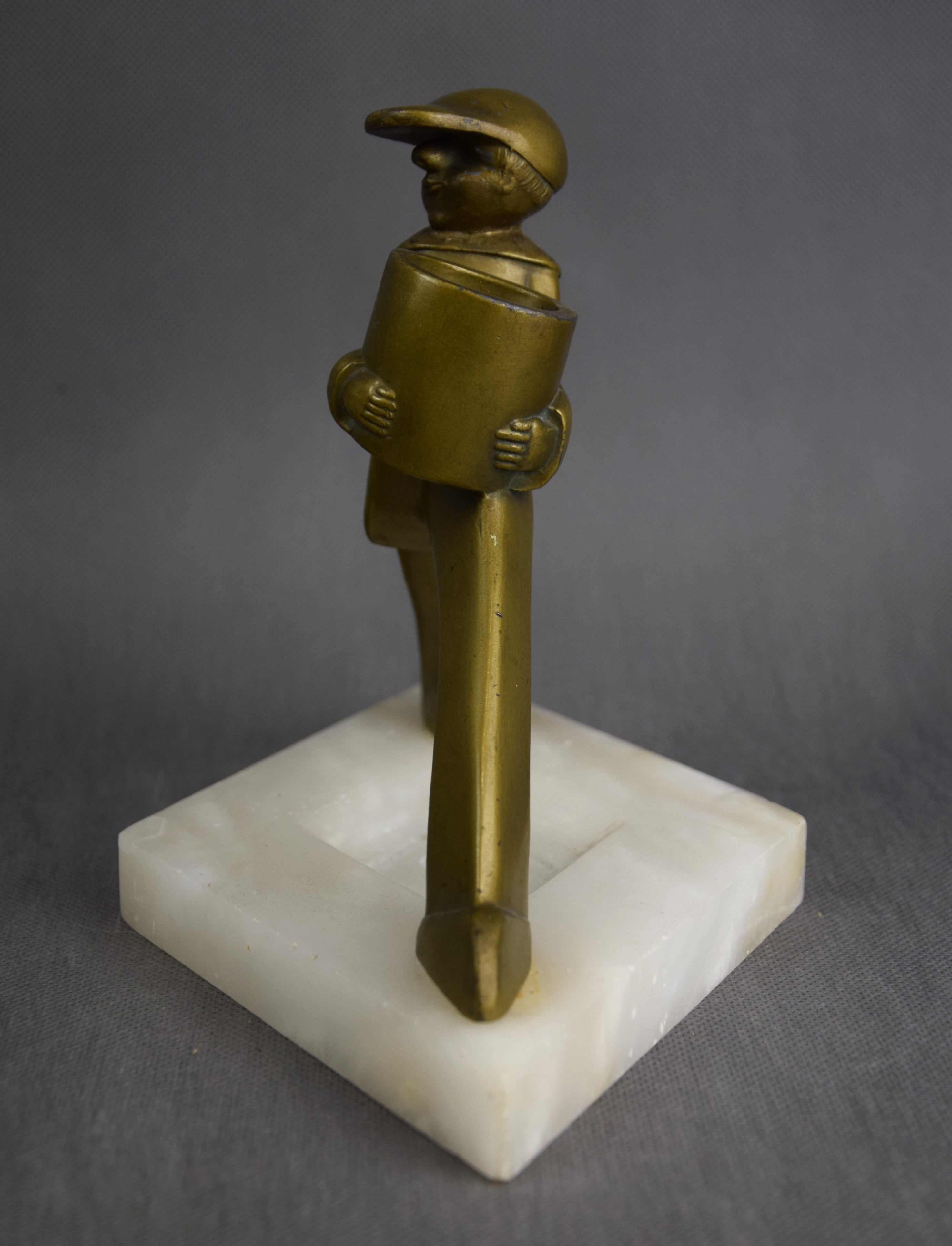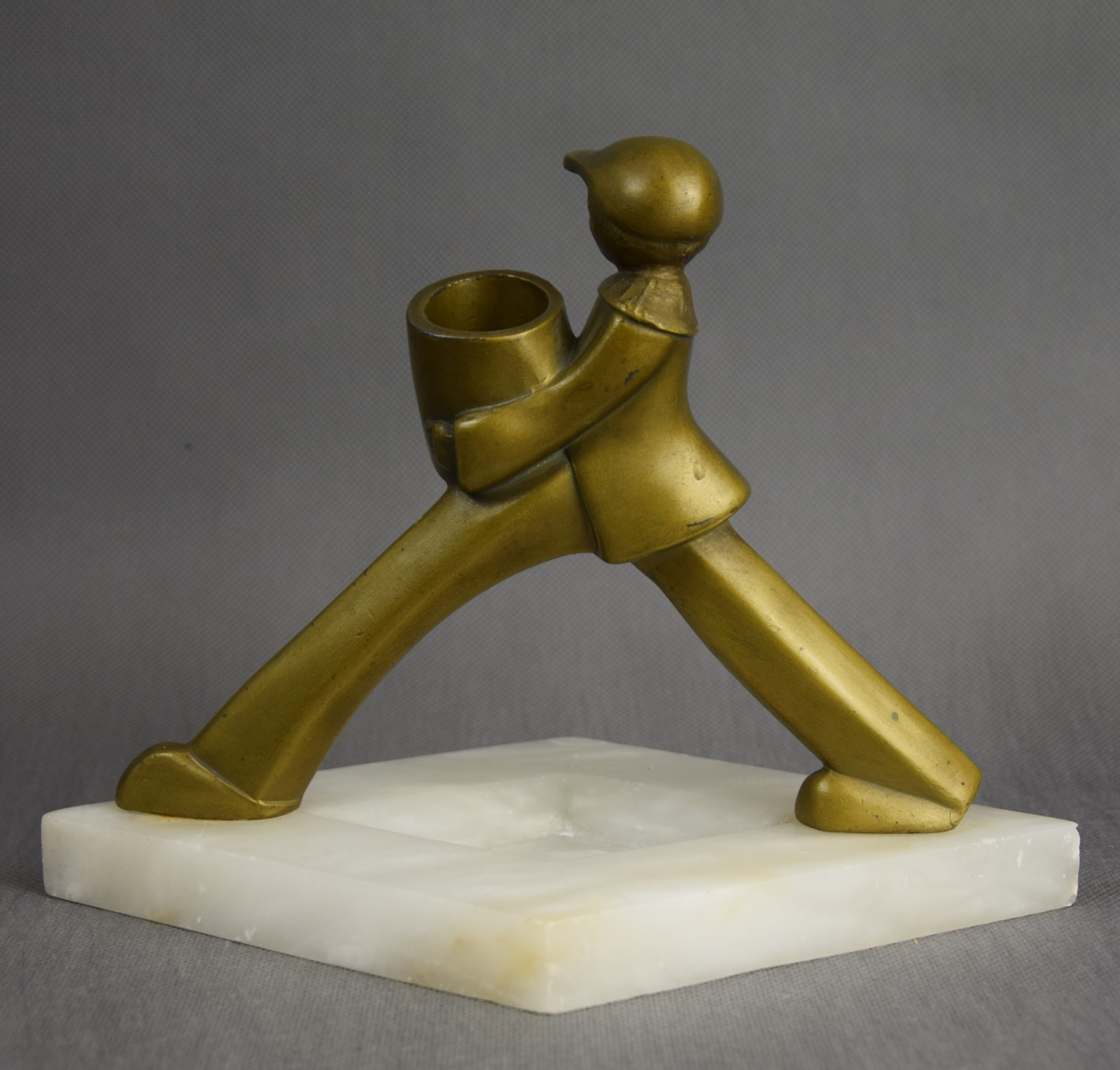 Popielnica w stylu Art Deco z figurą idącego chłopca w kaszkiecie.