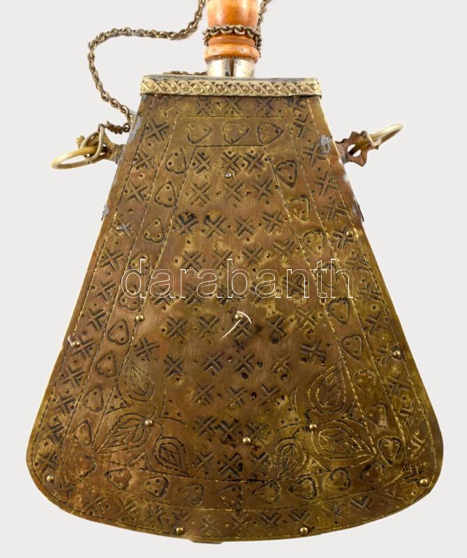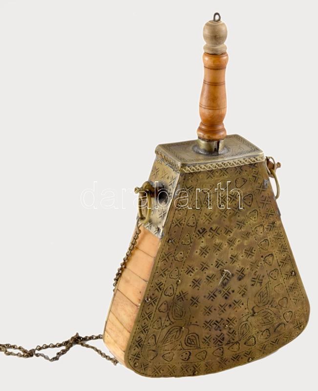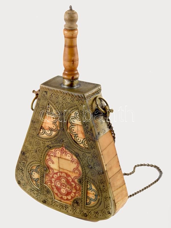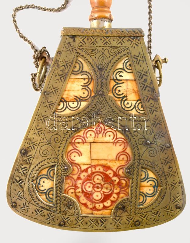 Jemeni tevecsont lőportartó. Cizellált ötvösmunka szerelékbe foglalt tevecsont elemek, előoldala festett, m: 30 cm /// Yemen camel bone powder flask. Chased metalwork fittings with mounted camel bone elements, painted front, height: 30 cm