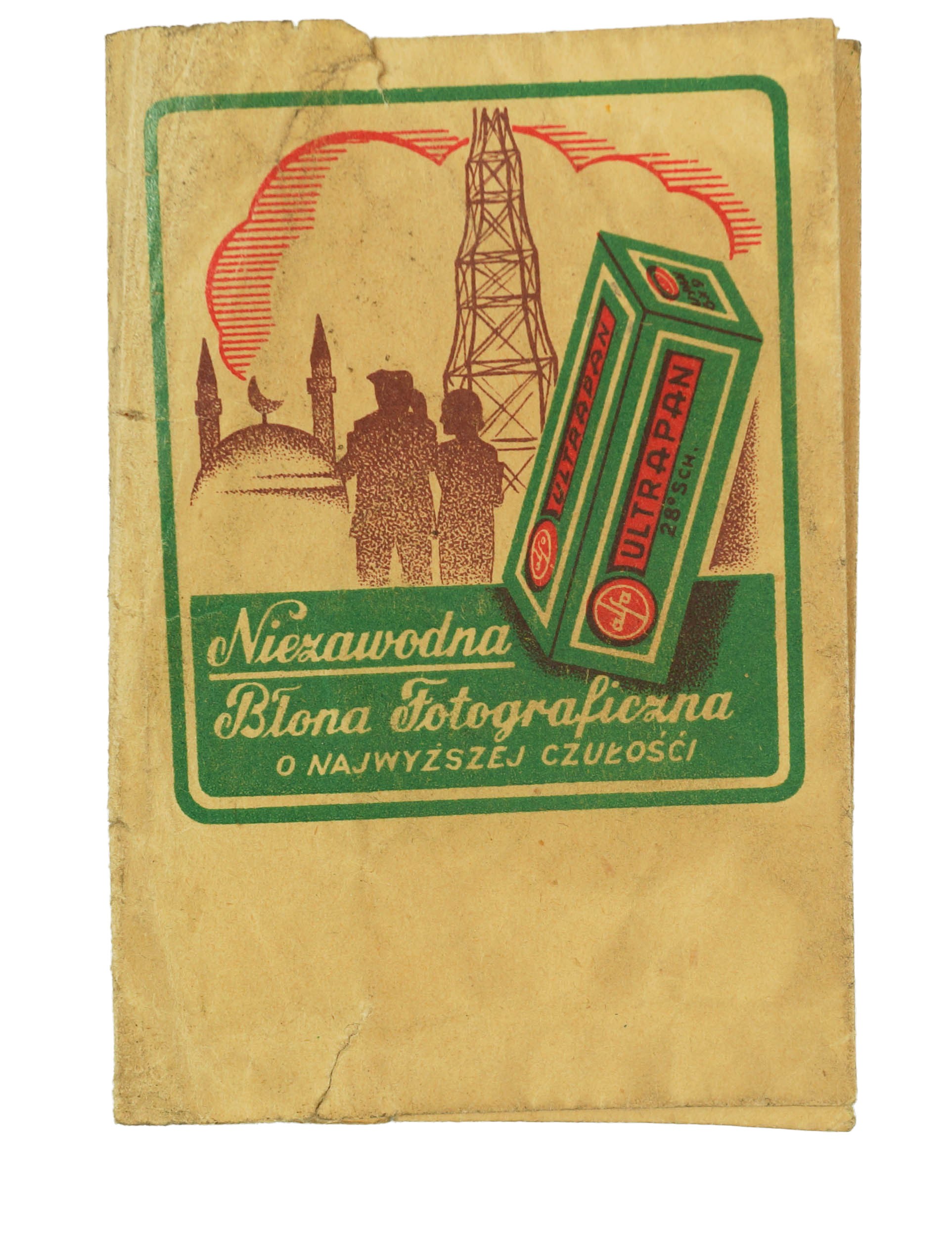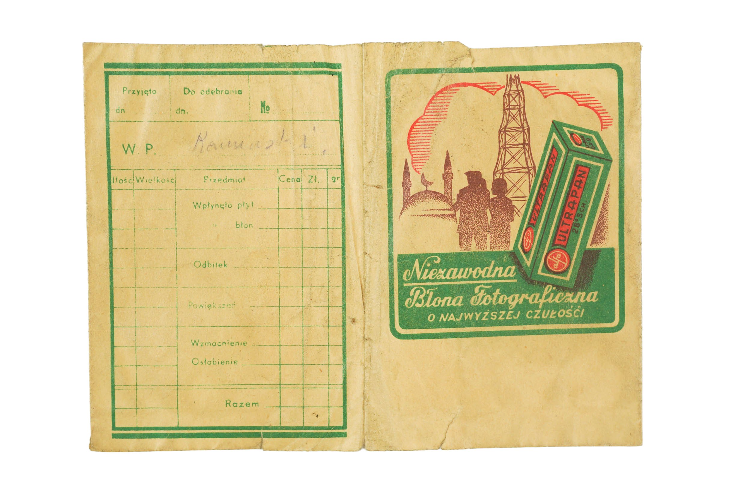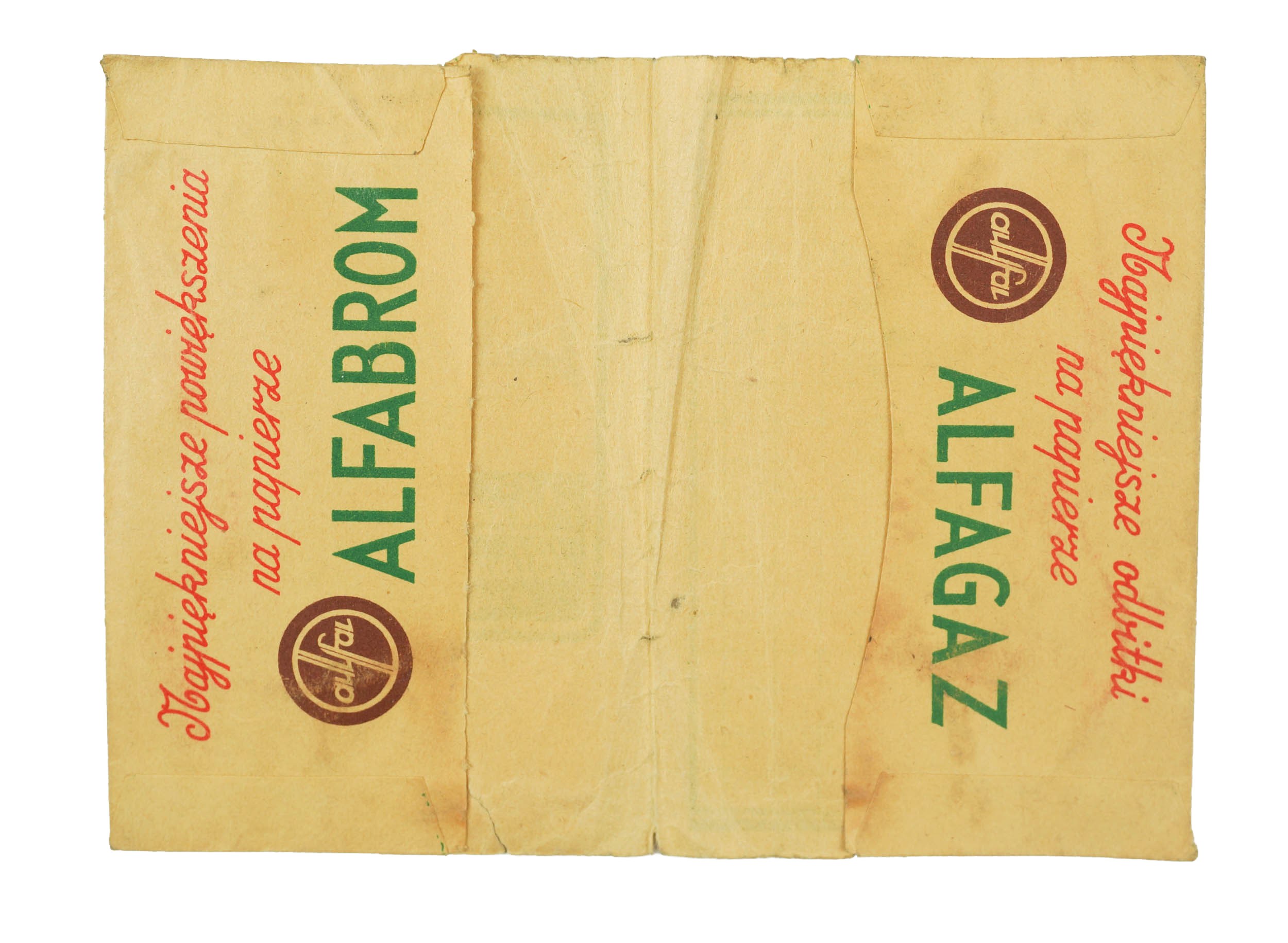 Reklama wyrobów firmy ALFA na papierowym opakowaniu do przechowywania negatywów lub zdjęć małoformatowych, pierwsza reklama: "Najpiękniejsze powiększenia na papierze Alfabrom / Alfagaz, druga reklama: Niezawodna błona fotograficzna o najwyższej czułości "Ultrapan"", f. 7 x 10cm
