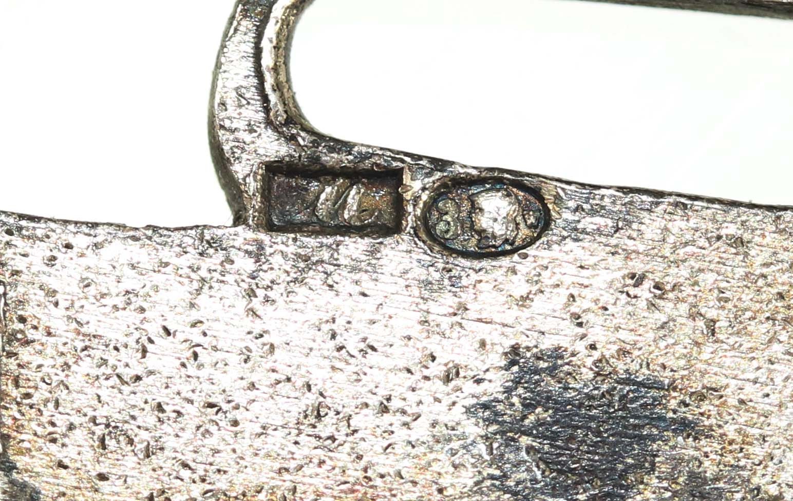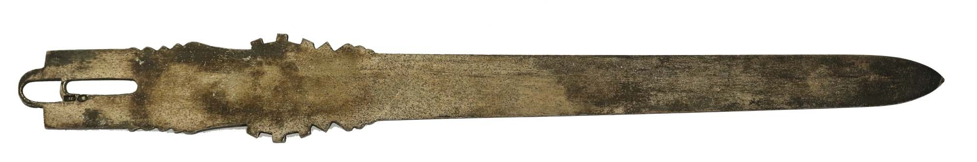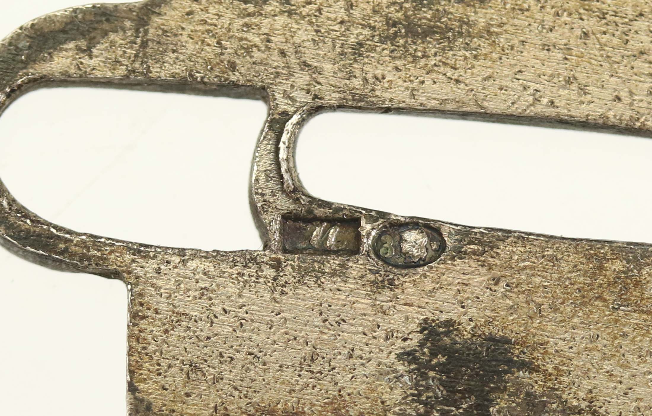 Nóż do papieru "Plan sześcioletni" 1950-1955, Metaloplastyka. Srebro, widoczna sygnatura wytwórcy "M" (Metaloplastyka) oraz warszawska próba srebra "3" przed 1963 r. Długość 19 cm, waga 39,1 g.