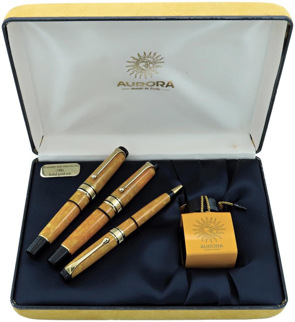 AURORA -Trittico- SOLE. Penna stilografica, penna roller, penna a sfera. N. 1367. Corpo delle penne in pregiata resina arancione. La stilografica prevede una modalità di ricarica a stantuffo e pennino M in oro 18 kt. Le penne sono nuove (la stilografica certamente mai provata né inchiostrata), vendute in scatola originale, controscatola (danneggiato), libretto di istruzioni e garanzia da compilare.