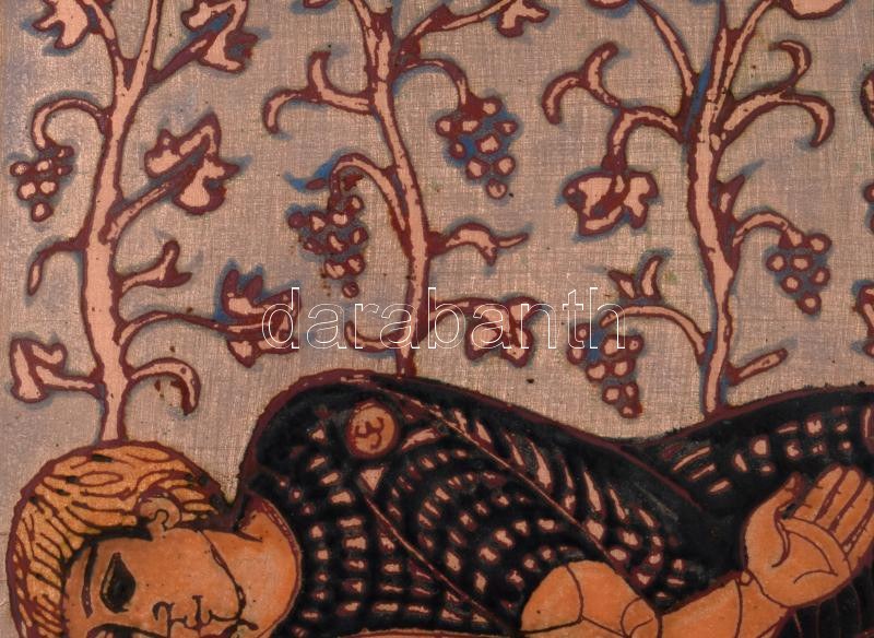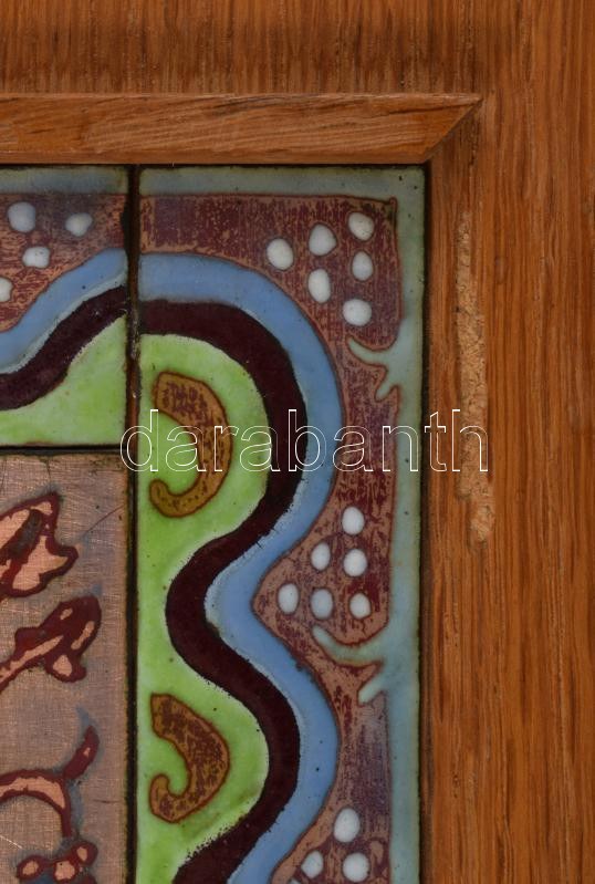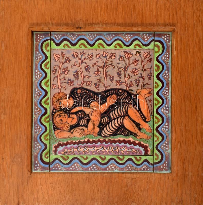 Stefániay Edit (1936-): Szerelmesek. Tűzzománc kép, kissé hiányos fa táblán, jelzett a hátoldalon, 20x20 cm /// Edit Stefániay (1936-): Lovers. Enamel painting on a slightly incomplete wooden board, signed on the reverse, 20x20 cm.