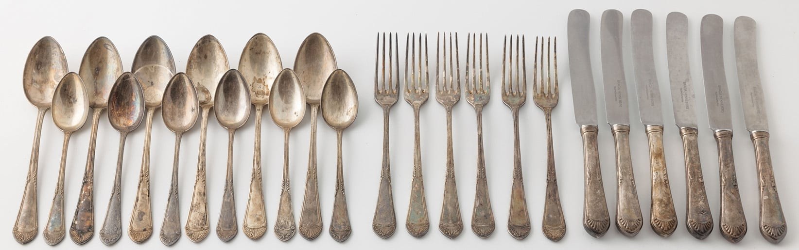 W składzie po 6 noży 21,5 cm, widelców 18 cm, łyżek 18 cm, łyżeczek 14,5 cm