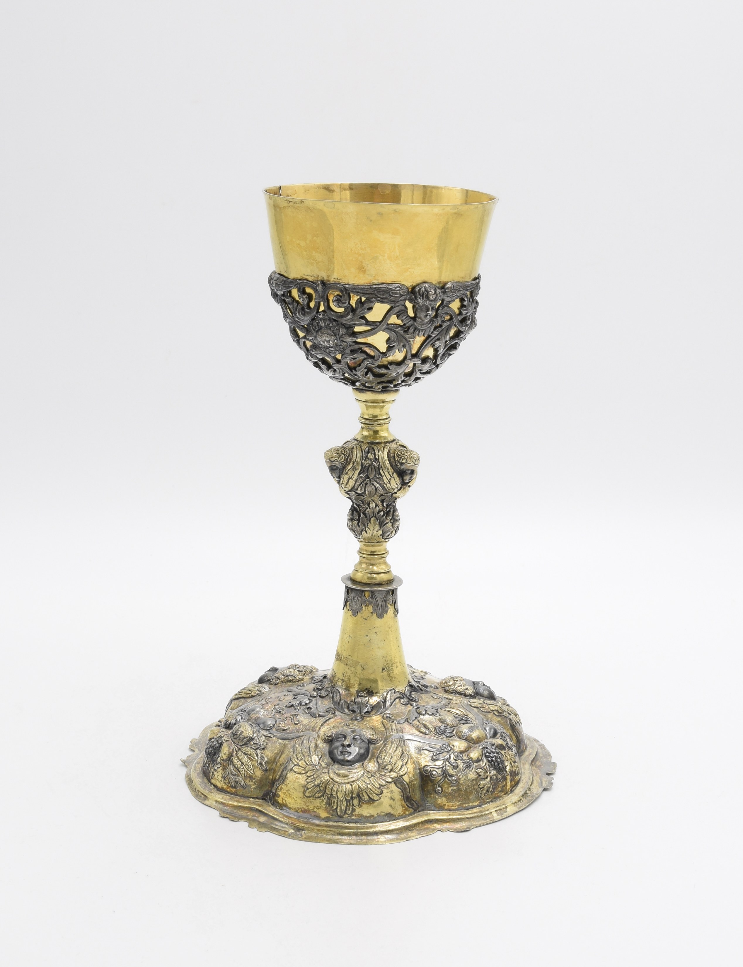 srebro częściowo złocone kute, repusowane, częściowo odlewane; wys. 26,2 cm, średnica stopy 17,1 cm; waga 518 g.