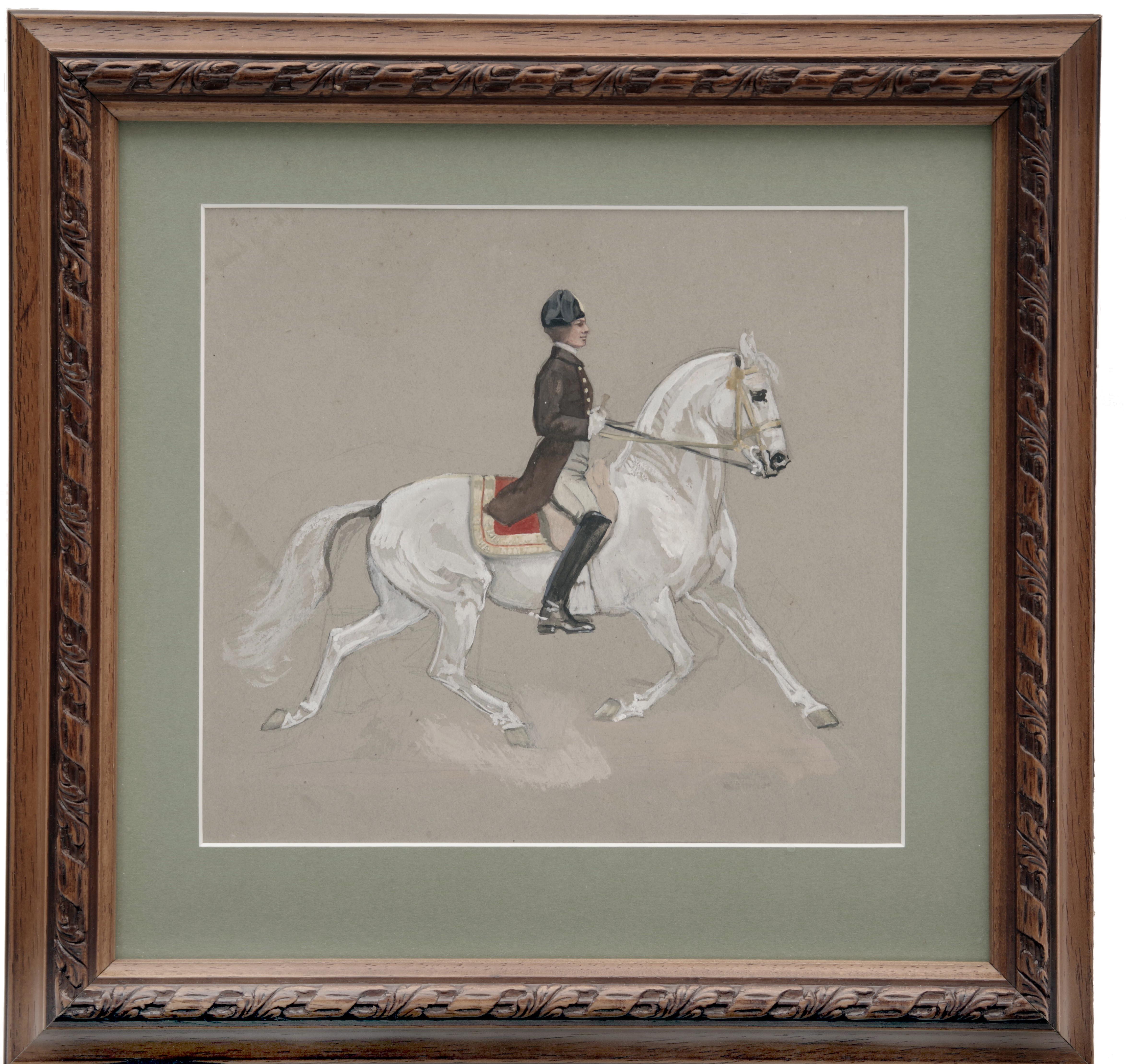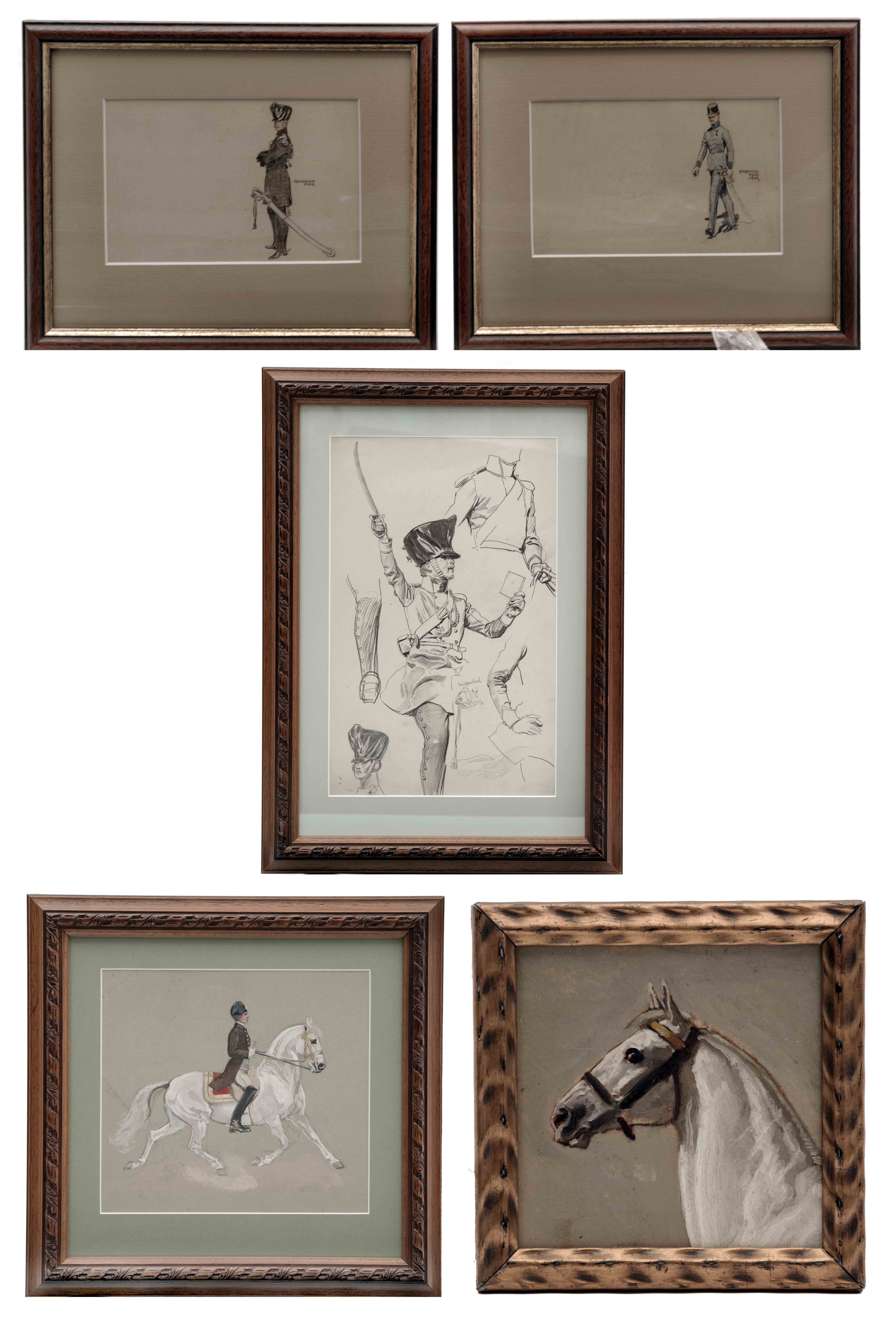 1) Koňská hlava. Olej na kartonu, nesignováno, nedatováno. Alexander Pock (1871 Znojmo - 1950 Vídeň). Vídeň kolem 1940, rozměry 12,5 12,5 cm. Rámováno, Stav 2 2) Piaffe (lipicán), akvarel na papíru, nesignováno, nedatováno. Vídeň 1930 - 1945, rozměry 22 x 20 cm. Paspartováno, rámováno, zaskleno. Stav 2+ 3) Důstojník rakouské kavalerie (studie), kresba tužkou, nesignováno, nedatováno. Vídeň kolem 1910, rozměry 20 x 32 cm. Rámováno, paspartováno, zaskleno. Stav 2+ 4) Párové obrázky - Důstojník kavalerie a Důstojník infanterie, kombinovaná technika, signováno vpravo uprostřed "ALEXANDER POCK" , Vídeň kolem 1910, rozměry 13,5 x 8,5 cm. Paspartováno, rámováno, zaskleno. Stav 2+ Z pozůstalosti po autorovi.