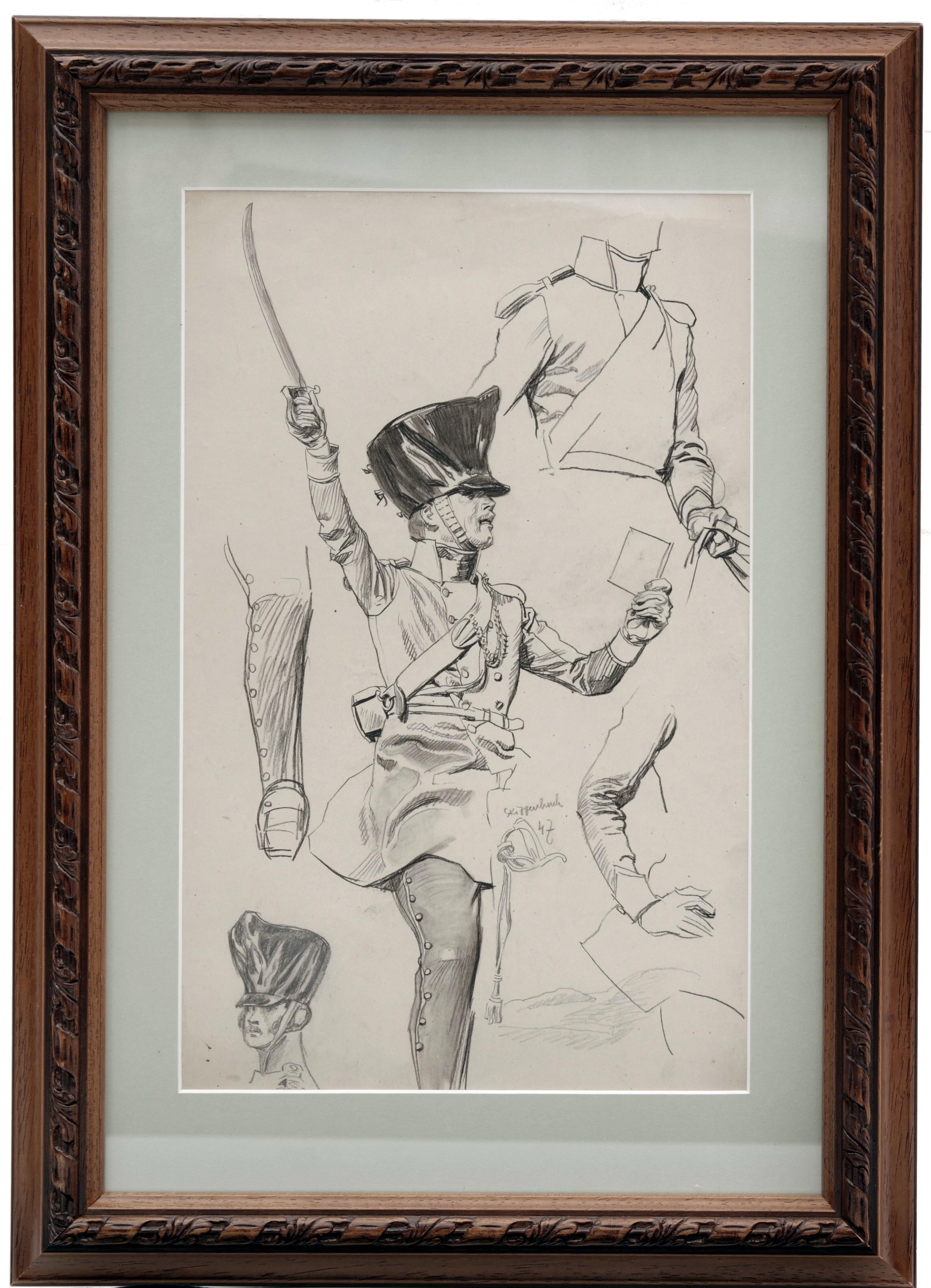 1) Koňská hlava. Olej na kartonu, nesignováno, nedatováno. Alexander Pock (1871 Znojmo - 1950 Vídeň). Vídeň kolem 1940, rozměry 12,5 12,5 cm. Rámováno, Stav 2 2) Piaffe (lipicán), akvarel na papíru, nesignováno, nedatováno. Vídeň 1930 - 1945, rozměry 22 x 20 cm. Paspartováno, rámováno, zaskleno. Stav 2+ 3) Důstojník rakouské kavalerie (studie), kresba tužkou, nesignováno, nedatováno. Vídeň kolem 1910, rozměry 20 x 32 cm. Rámováno, paspartováno, zaskleno. Stav 2+ 4) Párové obrázky - Důstojník kavalerie a Důstojník infanterie, kombinovaná technika, signováno vpravo uprostřed "ALEXANDER POCK" , Vídeň kolem 1910, rozměry 13,5 x 8,5 cm. Paspartováno, rámováno, zaskleno. Stav 2+ Z pozůstalosti po autorovi., 1) Horse head. Oil on cardboard, unsigned, undated. Alexander Pock (1871 Znojmo - 1950 Vienna). Vienna around 1940, dimensions 12.5 12.5 cm. Framed, Condition 2 2) Piaffe (Lipizzaner), watercolour on paper, unsigned, undated. Vienna 1930 - 1945, dimensions 22 x 20 cm. Mounted, framed, glazed. Condition 2+ 3) Officer of the Austrian Cavalry (study), pencil drawing, unsigned, unsigned. Vienna circa 1910, dimensions 20 x 32 cm. Framed, mounted, glazed. Condition 2+ 4) Paired pictures - Cavalry Officer and Infanterie Officer, mixed media, signed right centre 'ALEXANDER POCK' , Vienna circa 1910, dimensions 13.5 x 8.5 cm. Mounted, framed, glazed. Condition 2+ From the estate of the artist.