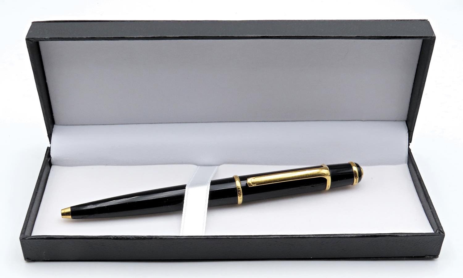 CARTIER. DIABLO. Penna a sfera. Corpo in resina nera con finiture dorate. Pietra all'estremità mancante. Penna usata venduta in scatola neutra.