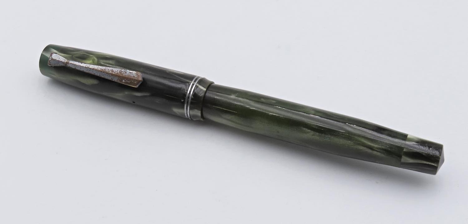 TIBALDI. INFRANGIBILE. Penna stilografica. Corpo celluloide verde marmorizzato. Ricarica a stantuffo. Pennino in oro giallo 14kt. Penna pari al nuovo, non inchiostrata venduta in scatola neutra.