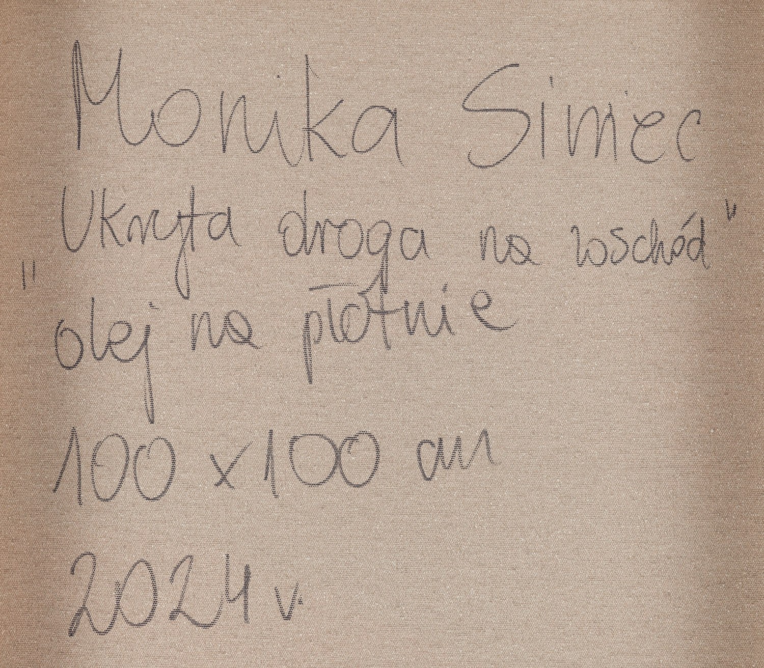 sygnowany, datowany i opisany na odwrociu: 'Monika Siwiec | "Ukryta droga na wschód" | olej na płótnie | 100x100cm | 2024r.'