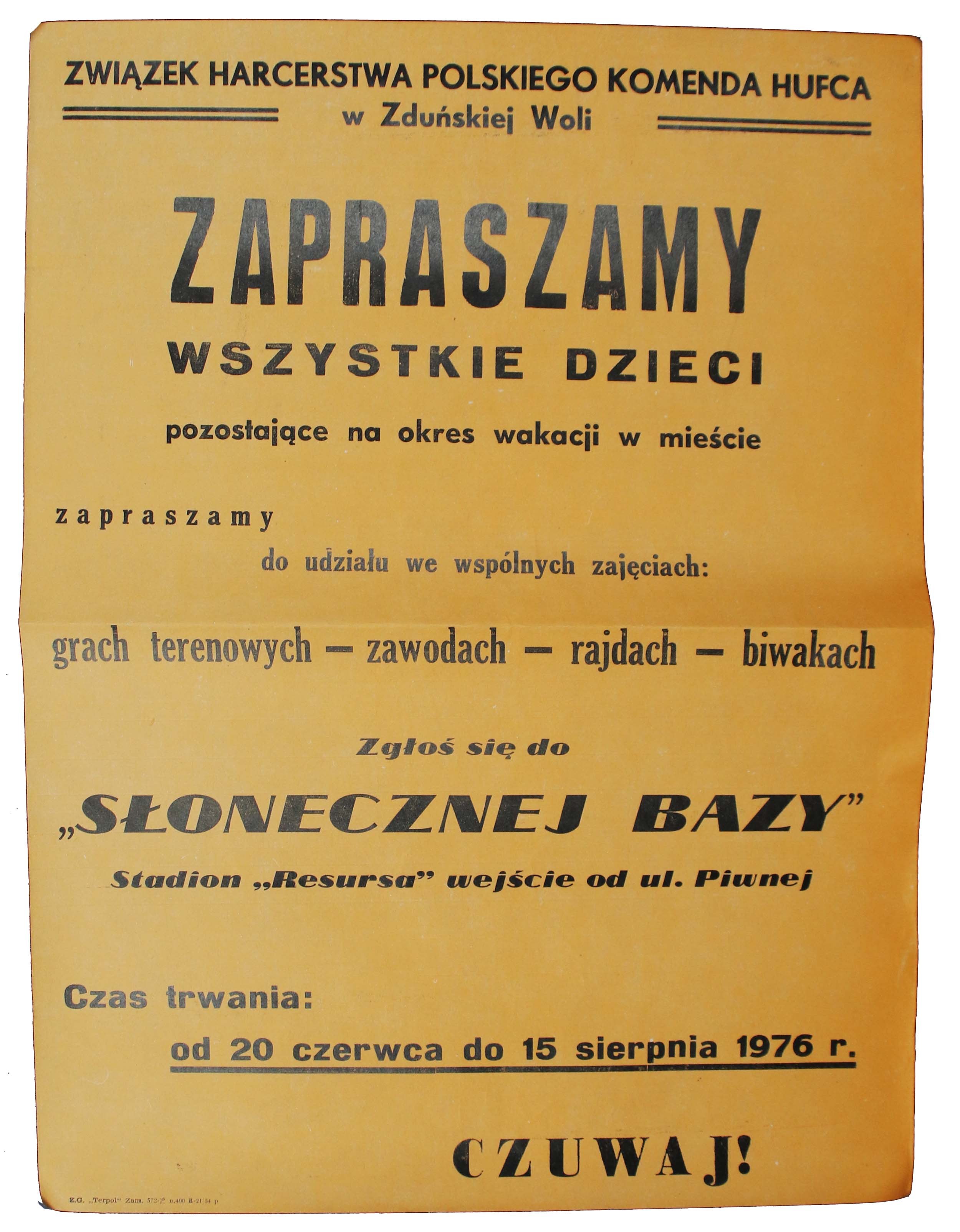 Plakat PRL - ZHP lato w mieście, Zduńska Wola 1976r. Wym. 29 x 40 cm.