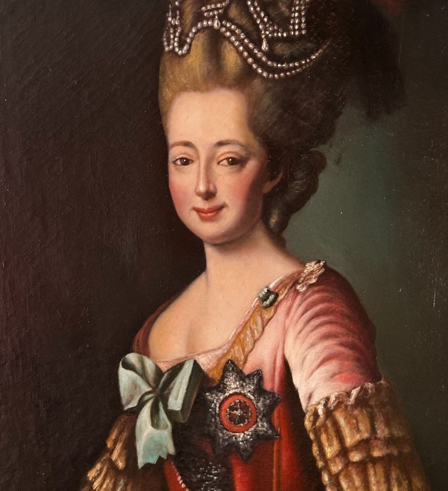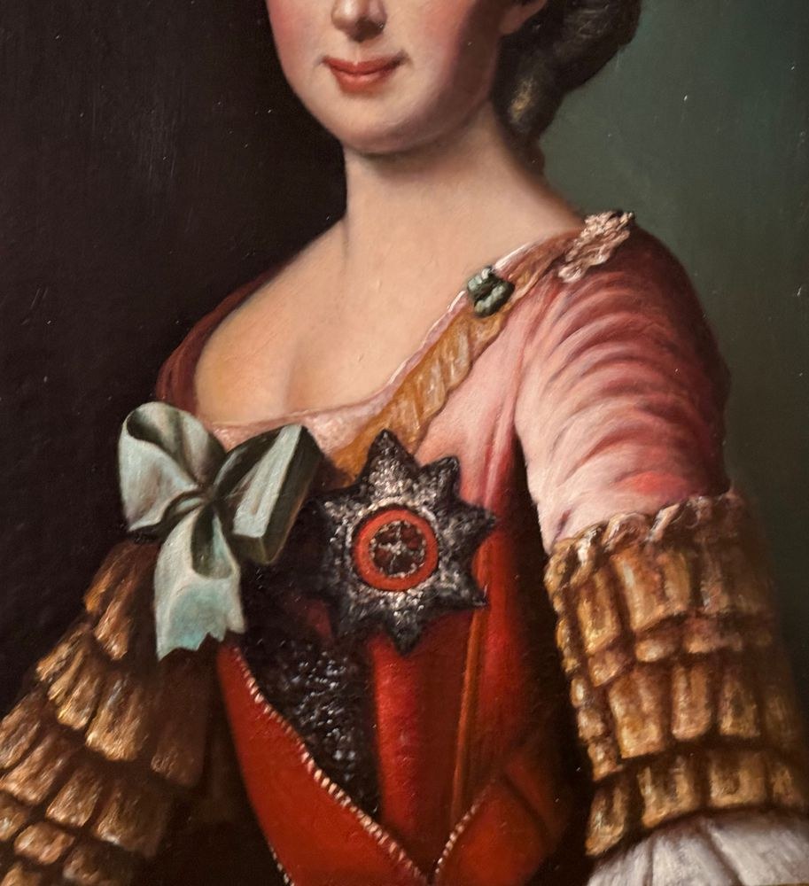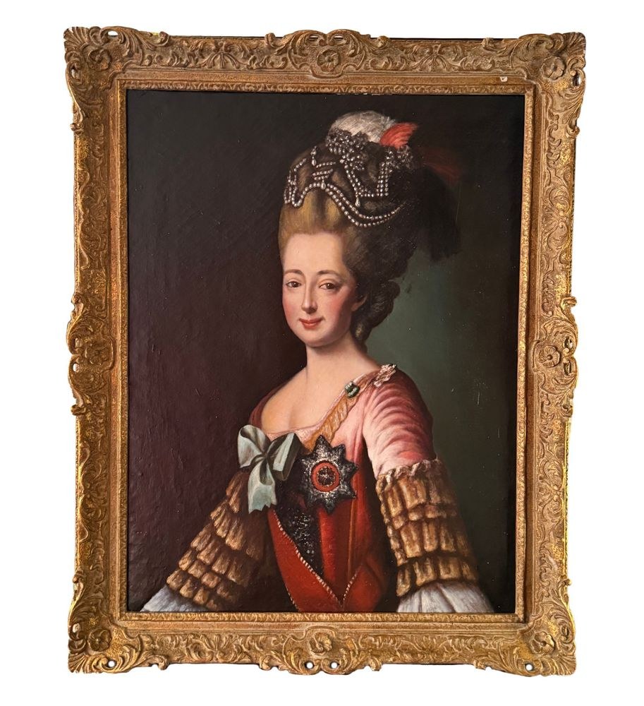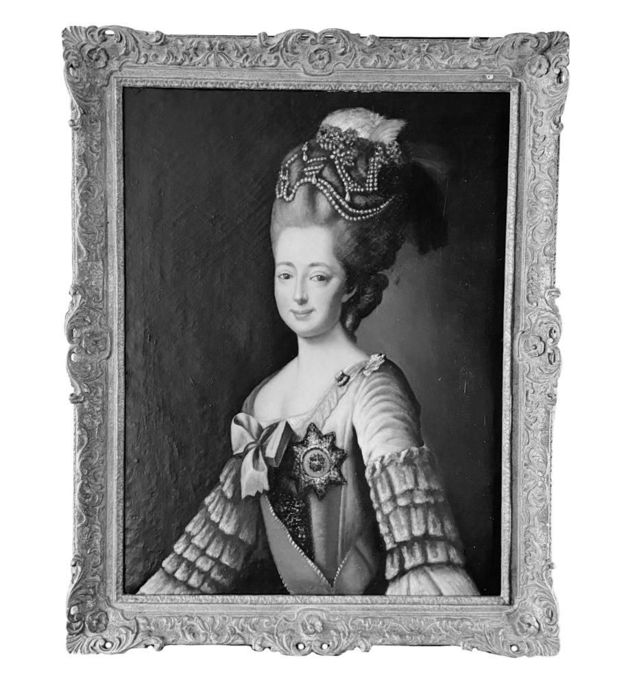 Oil painting on canvas, early 20th century, Russian school, depicting a Portrait of Maria Fyodorovna (1759–1828). Dimensions including the frame: 79x100 cm. Inner frame dimensions: 64x85 cm. By an anonymous artist. The artwork is in good condition.