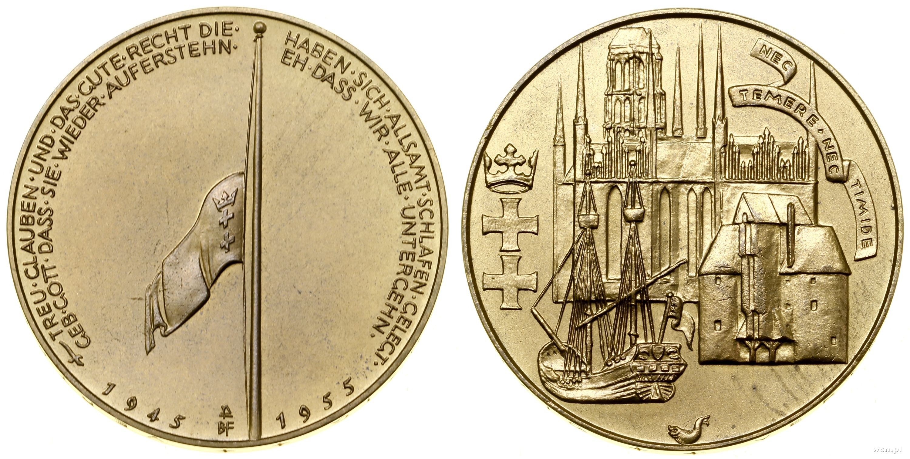 Aw: Maszt z flagą Wolnego Miasta Gdańska opuszczoną do połowy, na dole 1945 - 1955, TREU • GLAUBEN • UND • DAS • GUTE • RECHT DIE • - HABEN • SICH • ALLSAMT • SCHLAFEN • GELEGT • / GEB • GOTT • DASS • SIE • WIEDER • AUFERSTEHN • - EH • DASS • WIR • ALLE • UNTERGEHN •, Rw: Godło herbu Gdańska, bazylika Mariacka, Żuraw, statek oraz szarfa, na której NEC TEMERE NEC TIMIDE, Obrzeże: VERTRETUNG DER FREIEN STADT DANZIG