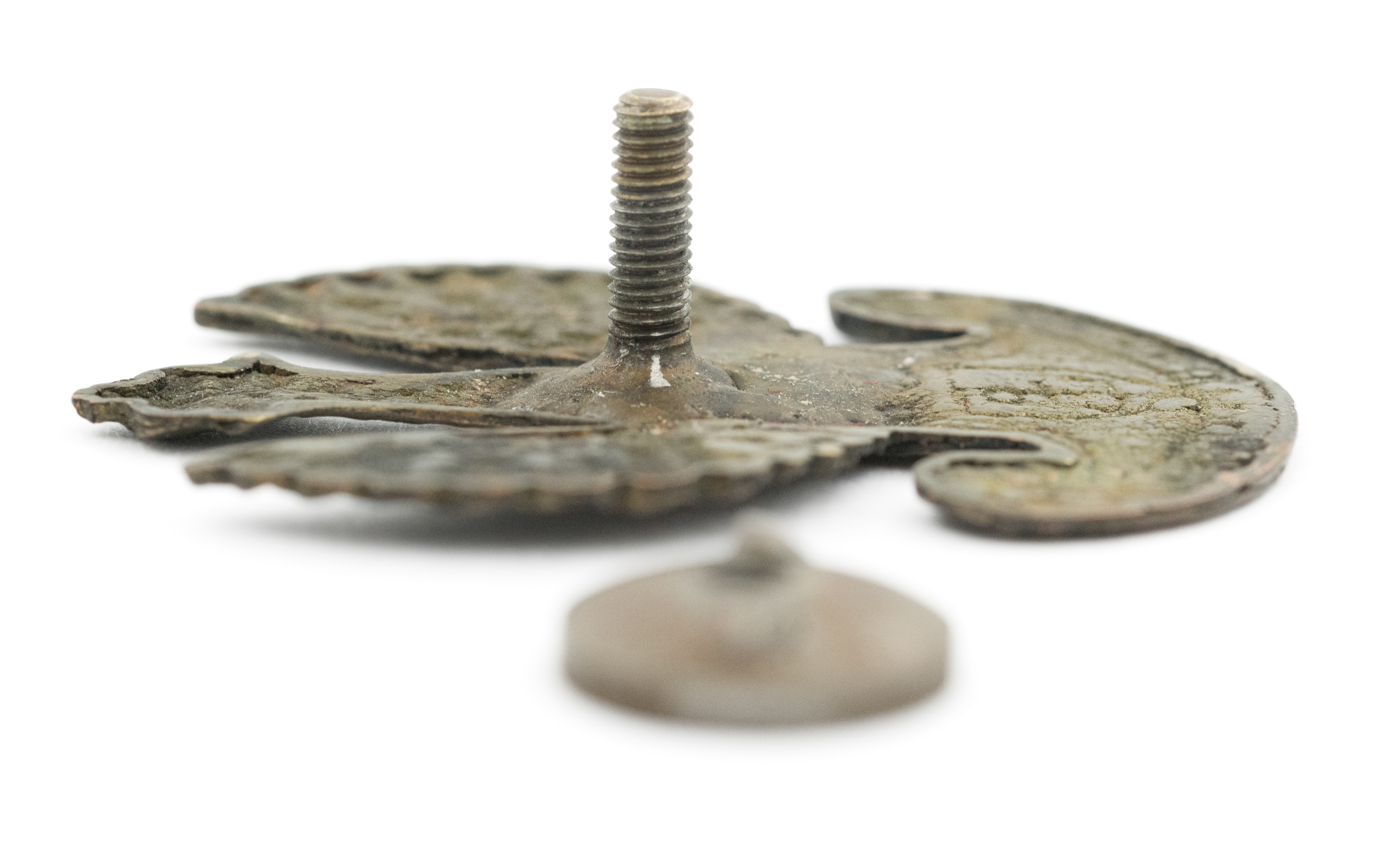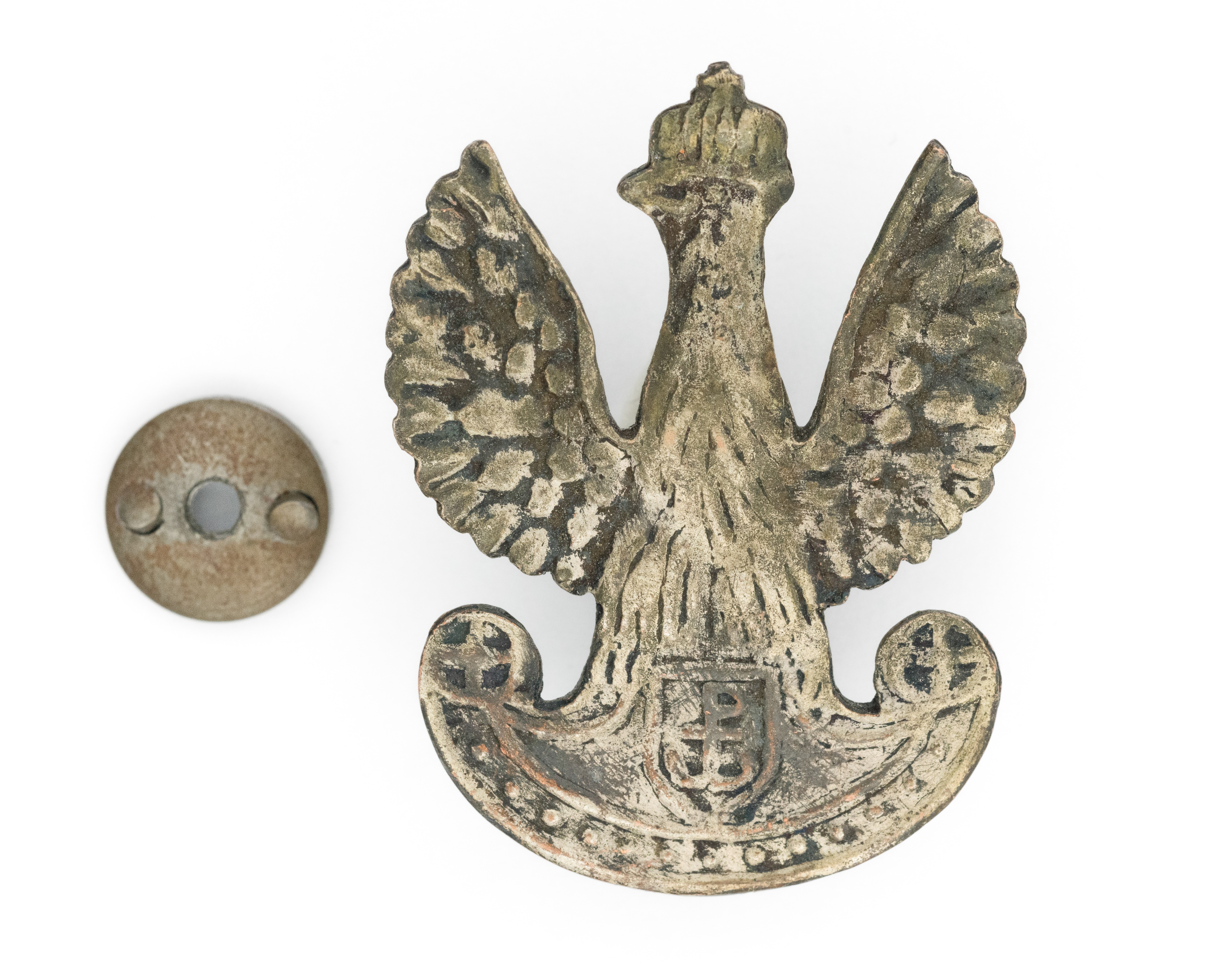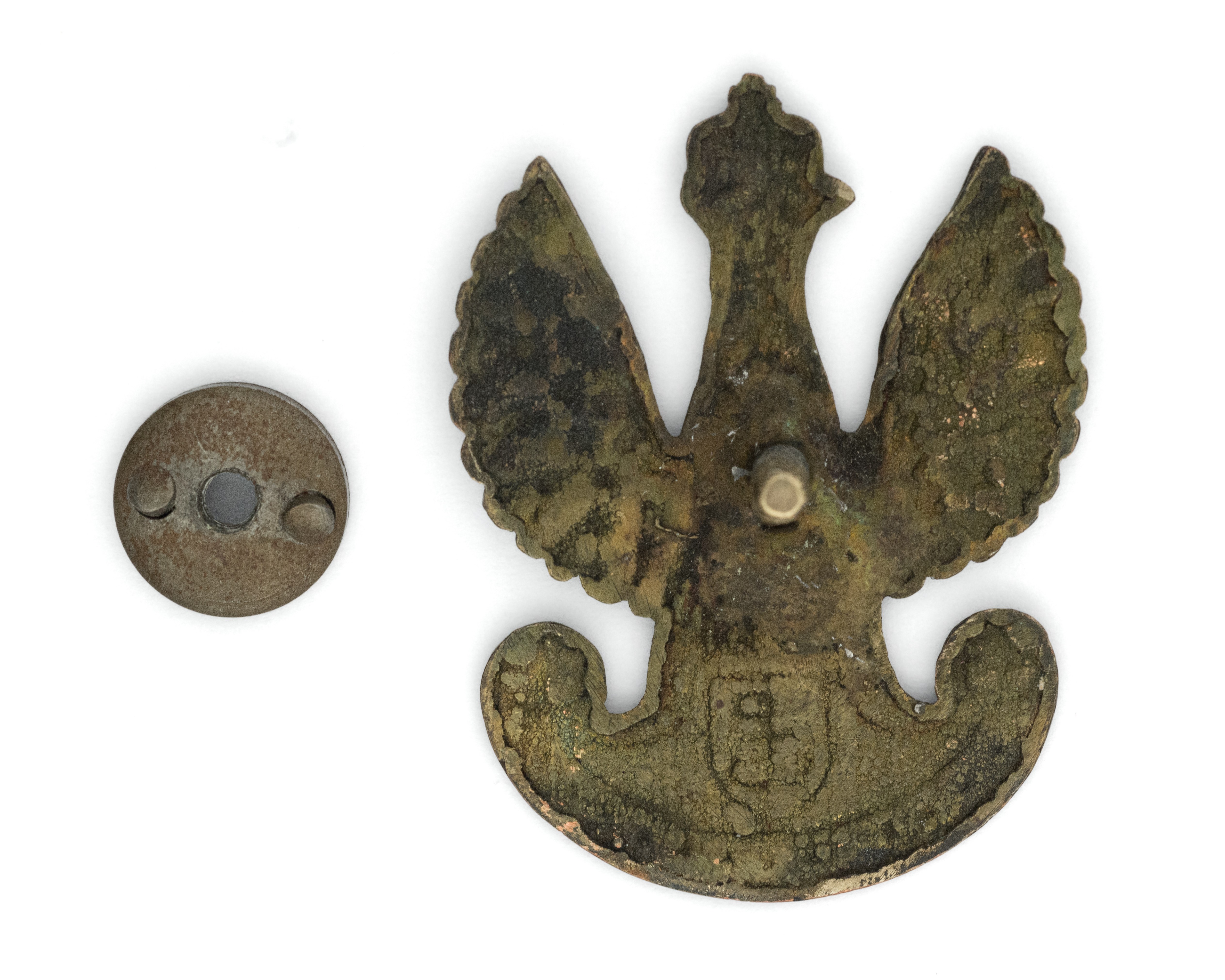 Orzeł z literami PW na tarczy amazonek - odlewany na podstawie orła produkcji pruszkowskiej