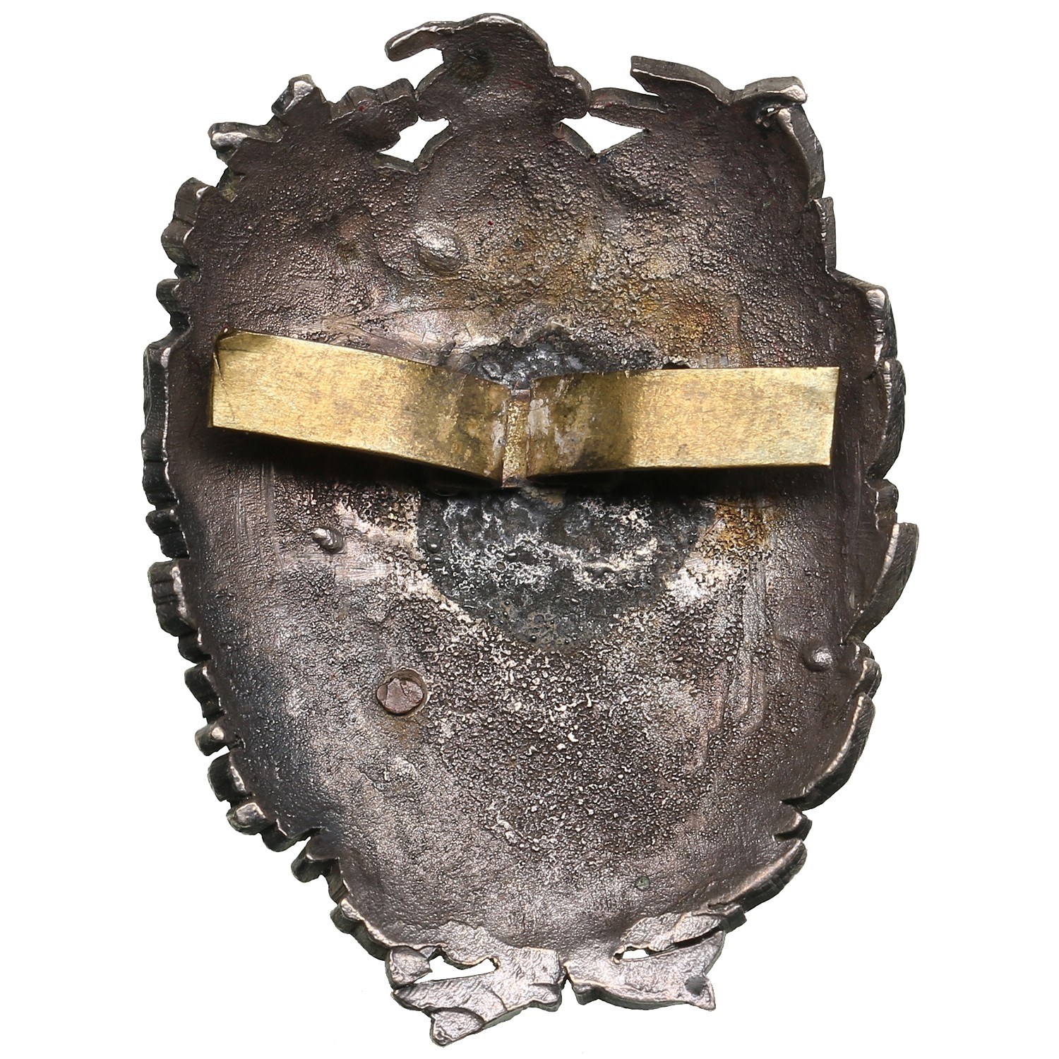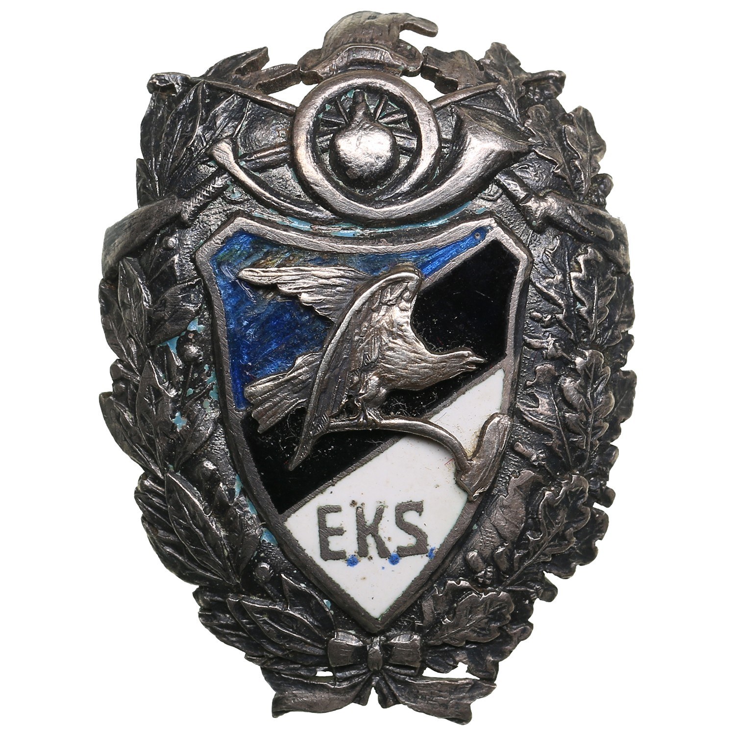 7.71g. 34x26mm. White metal and enamel, oak wreath with central shield in national colors, inscription EKS. At the top, crossed rifles with a hunting horn. Kivinuk 5002. Issued as the membership badge of the Estonian Hunting Society, an organization active during the interwar Republic of Estonia (1918–1940). After the primary functions of the Defence League had declined following the War of Independence, marksman and hunting squads—later organized into platoons-continued the development of Defence League shooting activities, promoting marksmanship skills and civic defense readiness throughout Estonia.