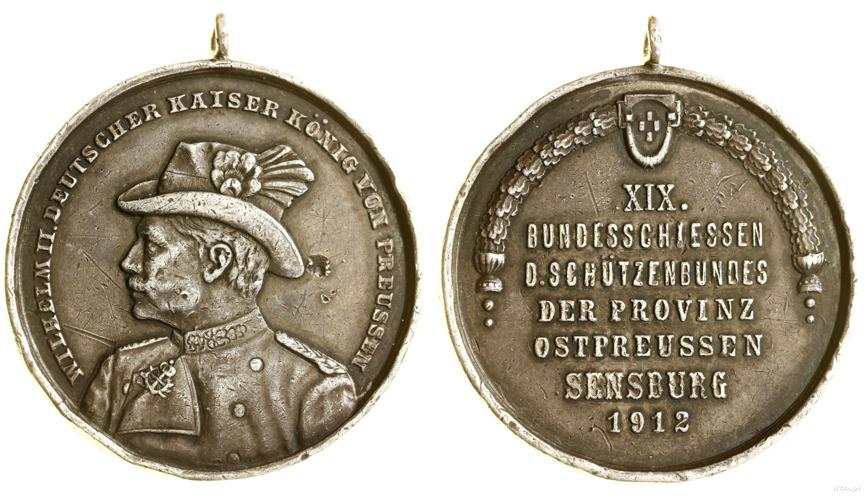 Popiersie Wilhelma II w lewo, WILHELM II. DEUTSCHER KAISER KÖNIG VON PREUSSEN, na stronie odwrotnej XIX. / BUNDESSCHIESSEN / D. SCHÜTZENBUNDES / DER PROVINZ / OSTPREUSSEN / SENSBURG / 1912, Obrzeże: Punca 990