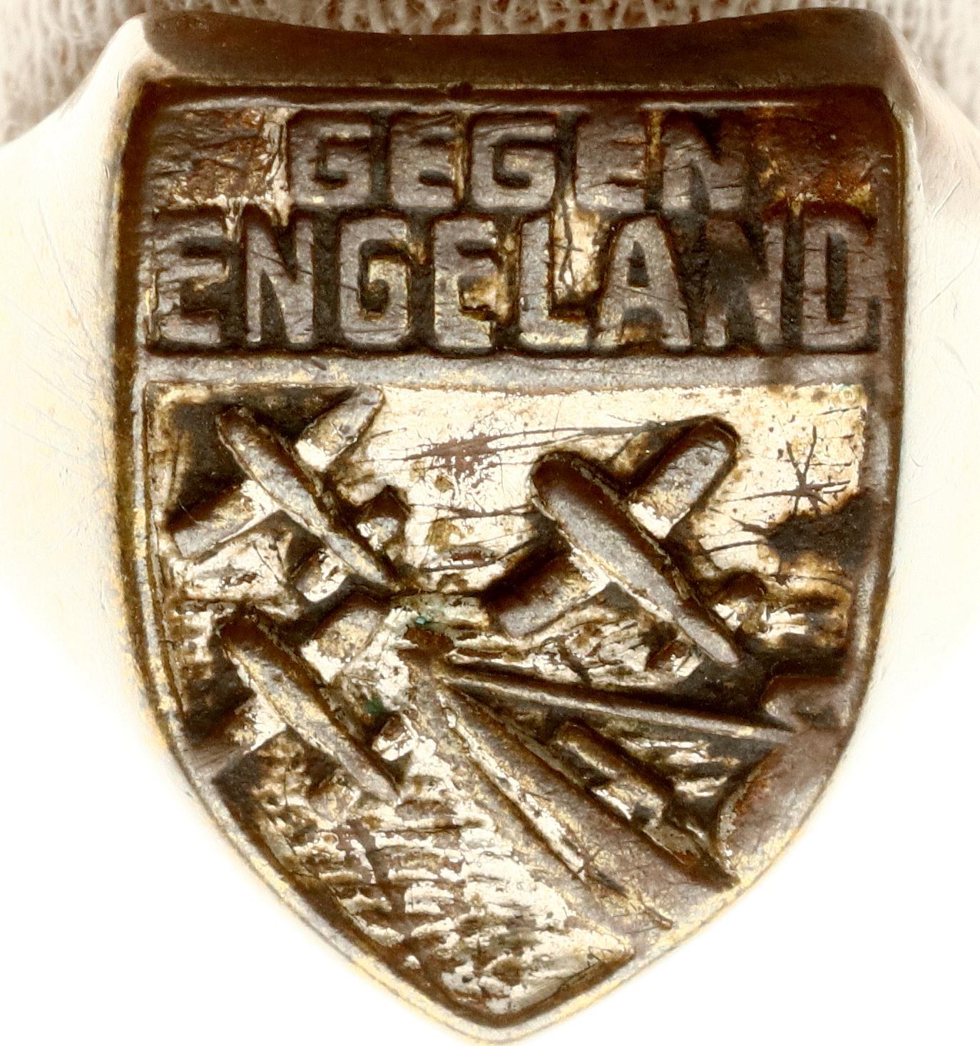 Ring 'Gegen Engeland'. On the reverse it reads 'Muster Gesetzl. Geschützt'. Ring with signs of age. Fantastic image with fighter planes and U-boot on the front. Brass silvered, 20x15mm -22x20 mm, 4.80 g. In box.