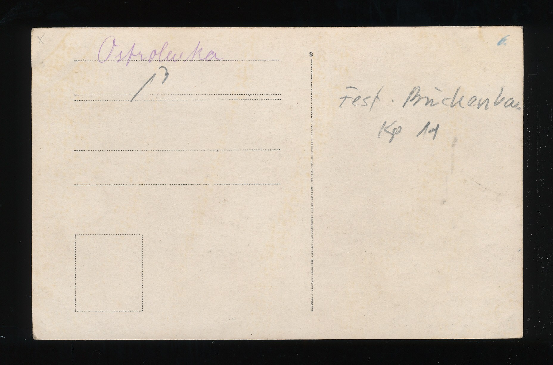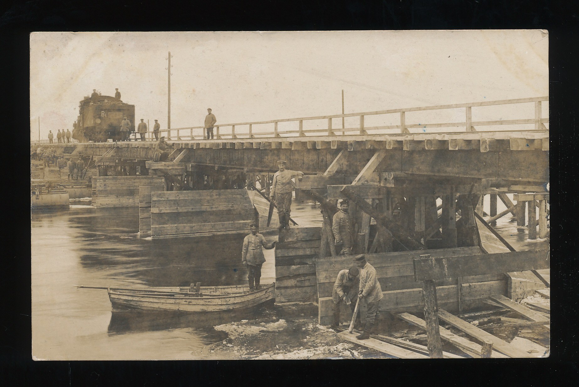 Ostrołęka. Pocztówka-fotografia przedstawiająca żołnierzy pruskich przy budowie mostu.
