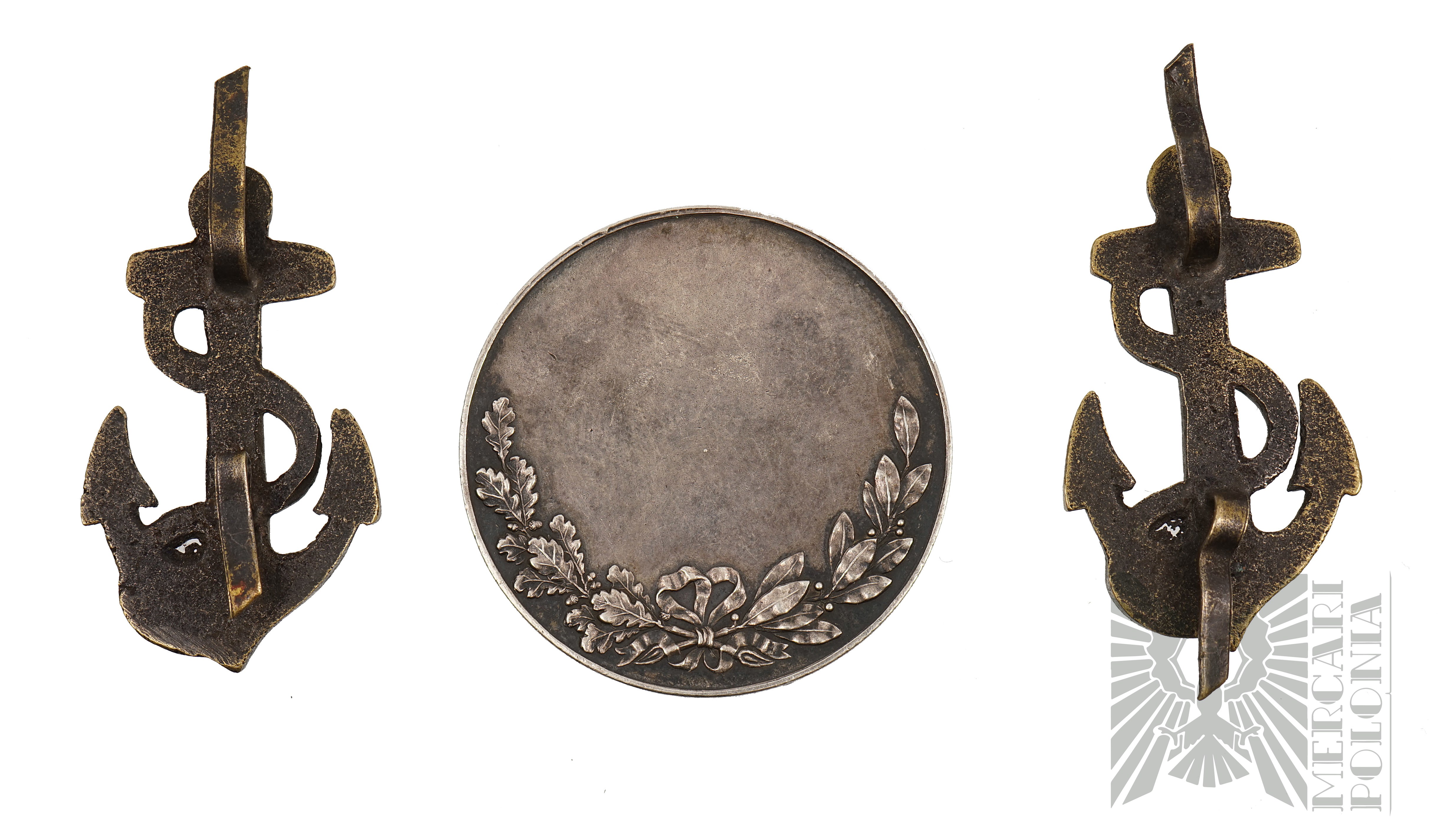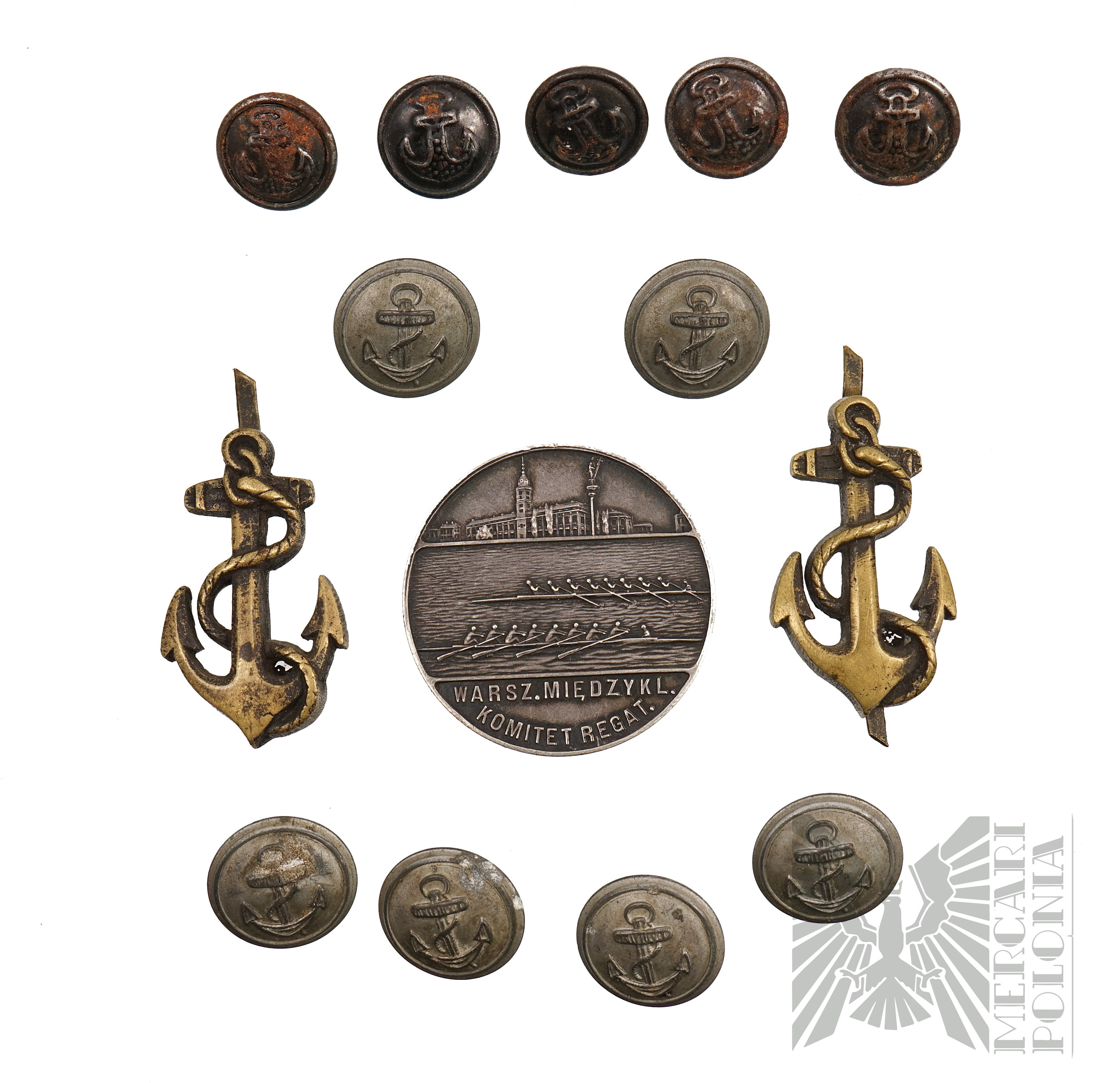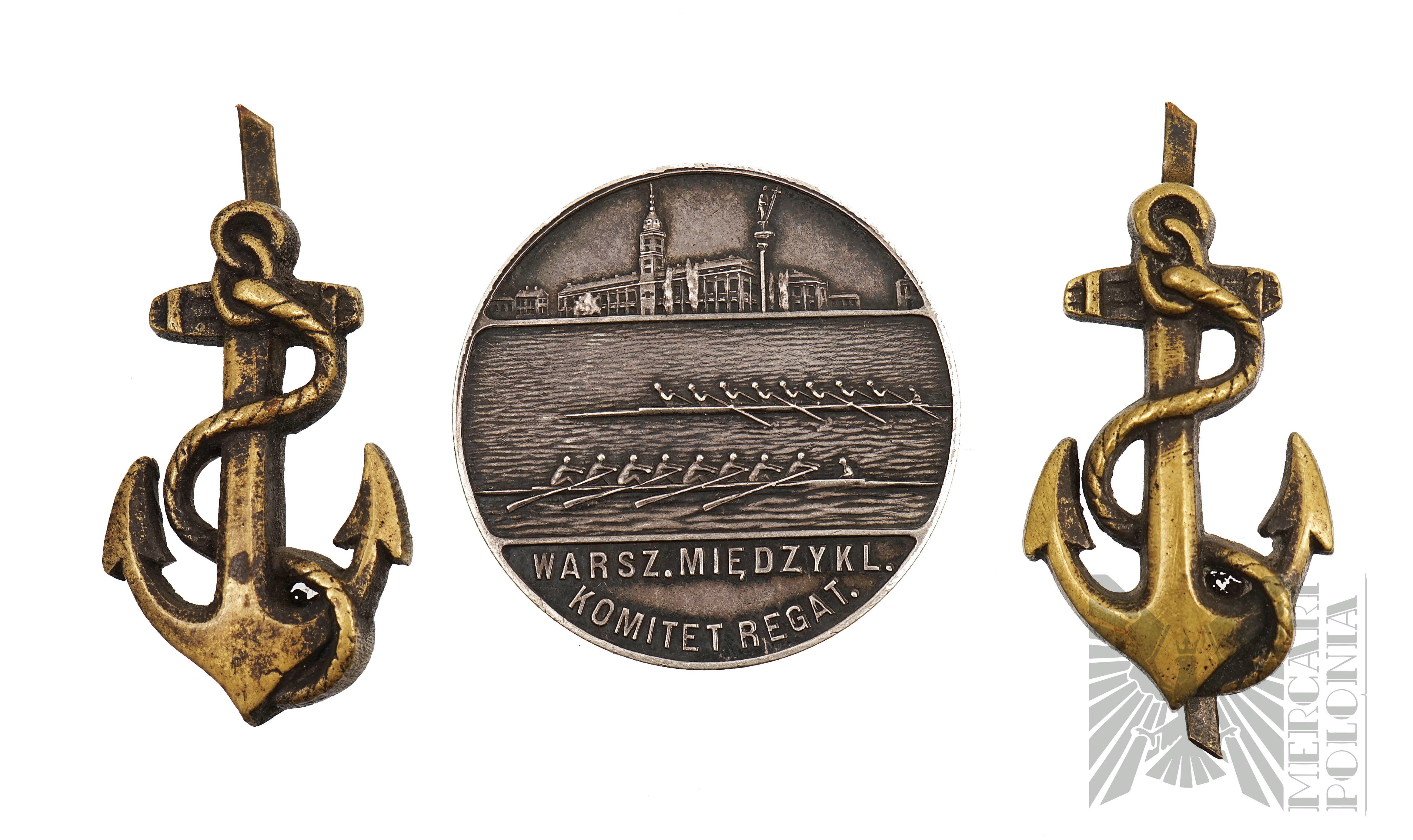 Zestaw z kolekcji WKW Warszawski Klub Wioślarek, w skład którego wchodzi medal Warszawski Międzyklubowy Komitet Regat, dwie kotwiczki kołnierzowy z uniformu najprawdopodobniej WKW oraz 11 guzików z wizerunkiem kotwicy, najprawdopodobniej z uniformów klubowych WKW.