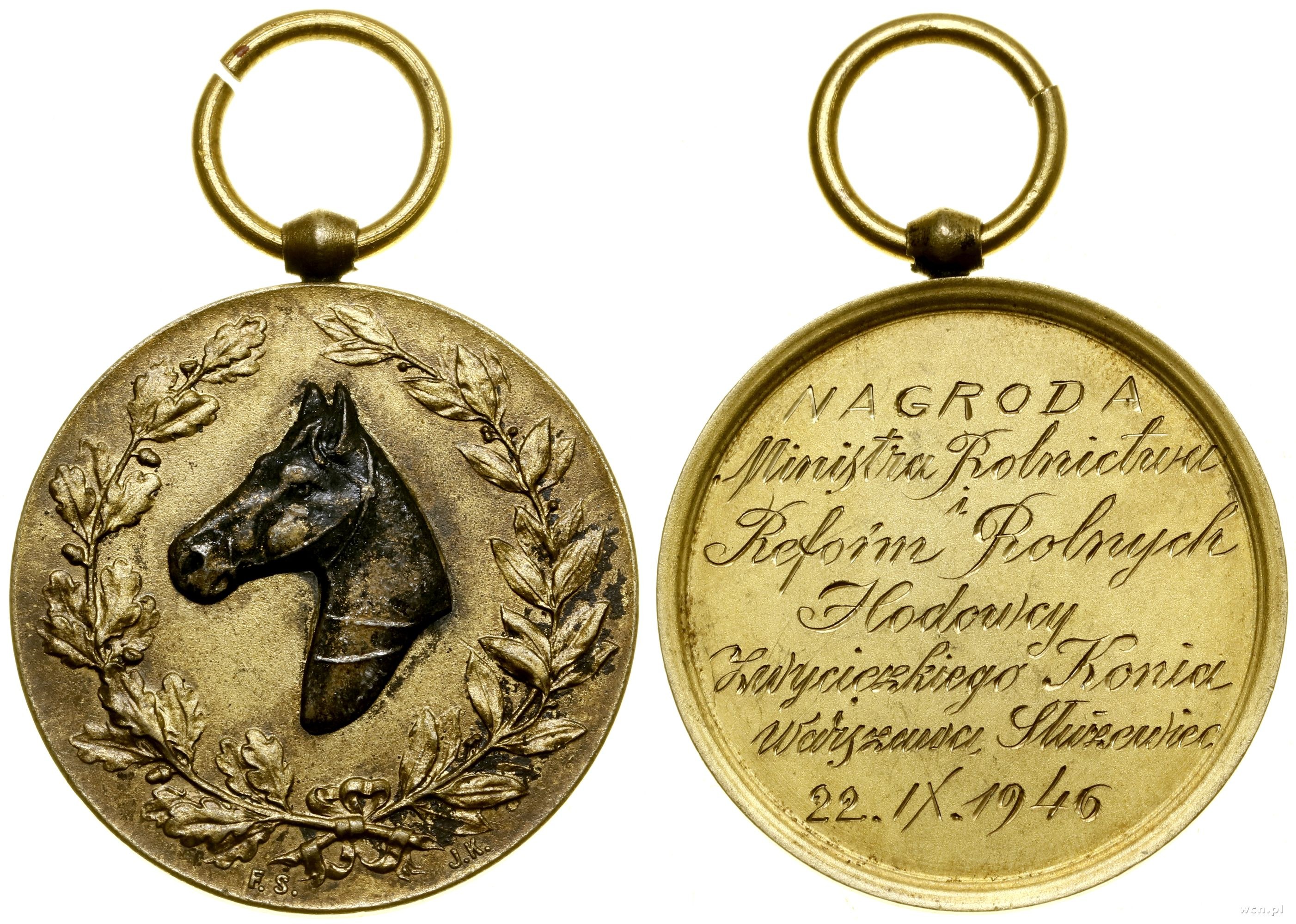 Popiersie konia w lewo, w wieńcu, na dole sygnatury F.S. i J.K., na stronie odwrotnej wygrawerowane NAGRODA / Ministra / Rolnictwa / i / Reform Rolnych / Hodowcy / Zwycięzkiego Konia / Warszawa Służewiec / 22.IX.1946, odznaka jednoczęściowa, mocowana na wstążkę, brak wstążki