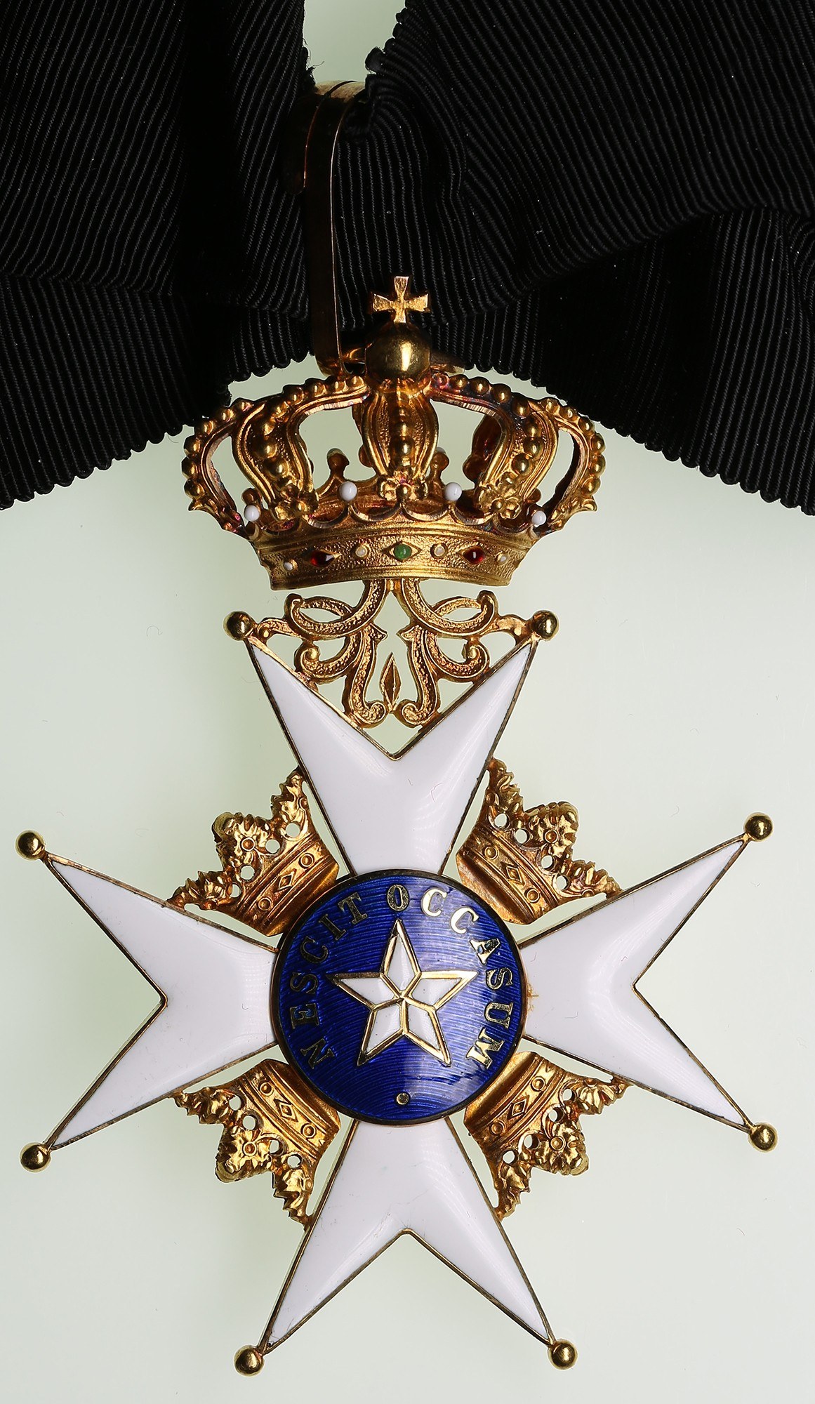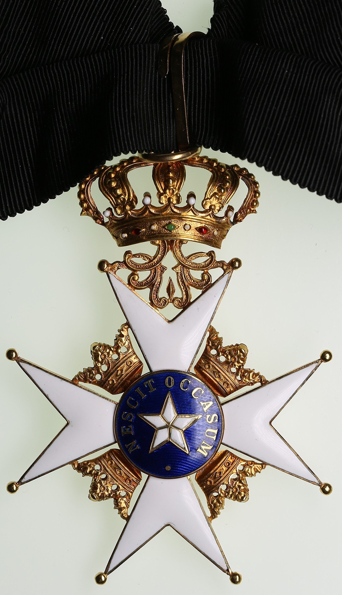 Total weight with strap 39.08g. ca 79х55mm. Gold. Au 0.750 (18K). Slight traces of wear. Hallmarks: The National three crowns (Tre Kronor), maker "CFC" (C.F. Carlman, Stockholm) and "18K" on the edge of the ray. Manufactured by C.F. CARLMAN, Stockholm. With original case of issue, red and black patterned paper exterior, inside lid in white satin, maker marked "C.F. CARLMAN STOCKHOLM", base with a raised platform incorporating a red felt fitted insert and neck black ribbon. Type II with Ball Finials. Instituted on 23 February 1748 by King Frederick I, together with the Orders of the Sword and of the Seraphim, the Royal Order of the Polar Star (Nordstjärneorden) was created to reward civil merit - devotion to duty, service to the Crown, as well as achievements in science, literature, and public institutions. Its motto, “Nescit Occasum” (“It knows no decline”), symbolizes Sweden as a constant and never-setting star. The insignia consists of a white-enameled Maltese cross with a blue central medallion bearing a five-pointed star and the motto, surmounted by a royal crown. The order’s ribbon is traditionally black, chosen to contrast with the white, blue, and gold cross; between 1975 and 2023, however, it was changed to blue with yellow edge stripes, before the original black ribbon was reinstated. The Order comprises five classes: Commander Grand Cross (KmstkNO) - badge on sash with breast star; Commander 1st Class (KNO1kl) - neck badge with star; Commander (KNO) - neck badge; Knight 1st Class (RNO1kl) - badge on chest ribbon; Knight (RNO) - badge on chest ribbon.Originally awarded to both Swedish and foreign recipients for civil achievements, the Order was restricted to foreigners after 1975 but reopened to Swedish citizens in 2023, alongside the reinstatement of the Orders of the Sword and of Vasa.Today, the Royal Order of the Polar Star remains one of Sweden’s principal state honors, symbolizing enlightened service and enduring loyalty to the nation.