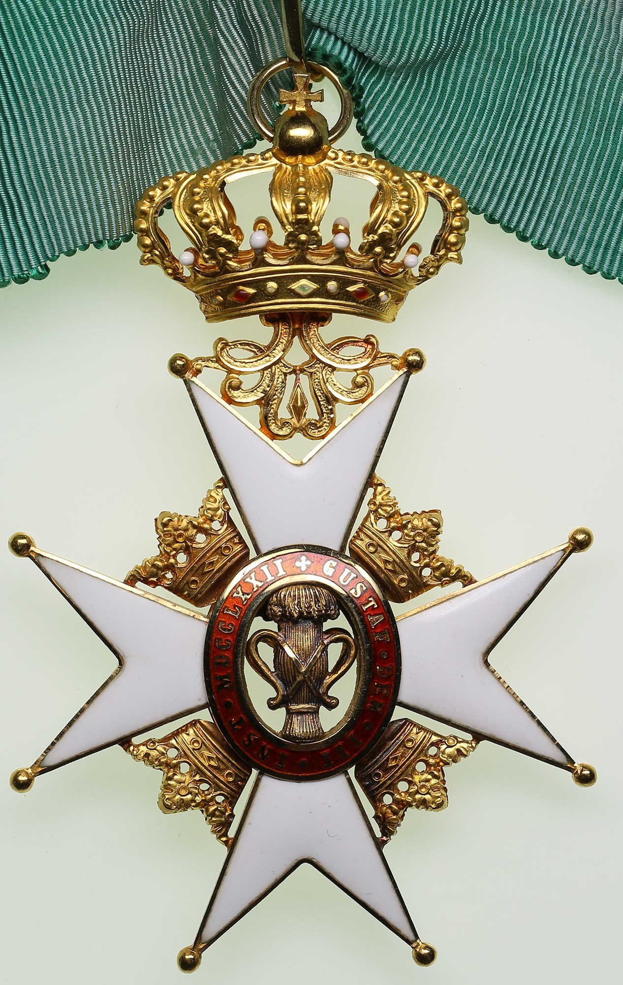 Total weight with the strap 44.75g. 83x55mm. Gold. Au 0.750 (18K). Slight traces of wear. Hallmarks: The National three crowns (Tre Kronor), maker "CFC" (C.F. Carlman, Stockholm) and "18K" on the edge of the ray. Manufactured by C.F. CARLMAN, Stockholm. With original Spink case and neck green ribbon. Type II. Instituted on 29 May 1772 by King Gustav III, the Royal Order of Vasa (Kungliga Vasaorden) was established to recognize service to the Swedish state and society, particularly in the fields of agriculture, mining, commerce, crafts, and industry. It was named after the House of Vasa, the royal dynasty founded by Gustav Vasa, whose emblem—a golden sheaf of wheat—symbolized the prosperity of the nation and the virtues of productive labor. Unlike other Swedish royal orders reserved for the nobility, clergy, or military officers, the Order of Vasa was open to all citizens, rewarding merit and achievement irrespective of social rank or birth. Following the 1974 reform of Sweden’s honors system, the order became dormant, along with the Order of the Sword, while the Orders of the Seraphim and the Polar Star remained active only for foreigners and members of the royal family. In 2022, the Riksdag passed a law re-establishing the Swedish orders for national recipients, and since 1 February 2023, the Orders of Vasa and Sword have once again been awarded to Swedish citizens. The first investiture in modern times took place on 21 March 2024, with recipients including the members of ABBA. The insignia consists of a white-enameled Maltese cross, with a central medallion bearing a golden sheaf on a black field, surrounded by a red enamel ring inscribed “Gustaf III Instiktare 1772” (“Instituted by Gustaf III, 1772”), and surmounted by a royal crown. Between the arms of the cross appear small crowns. The ribbon of the Order is green, reflecting its association with agriculture and fertility. The Order comprises five classes: Commander Grand Cross - badge on sash or collar with star on chest; Commander 1st Class - neck badge with star; Commander - neck badge; Knight 1st Class - badge on chest ribbon; Knight - badge on chest ribbon. Today, the Royal Order of Vasa represents Sweden’s traditional civil distinction for achievements in economic, scientific, and cultural advancement, reaffirming Gustav III’s Enlightenment ideal of rewarding merit and national contribution.