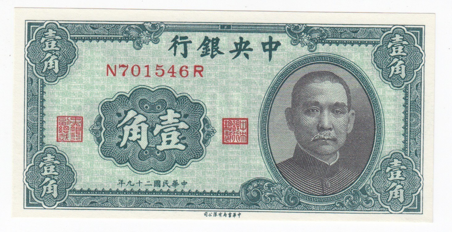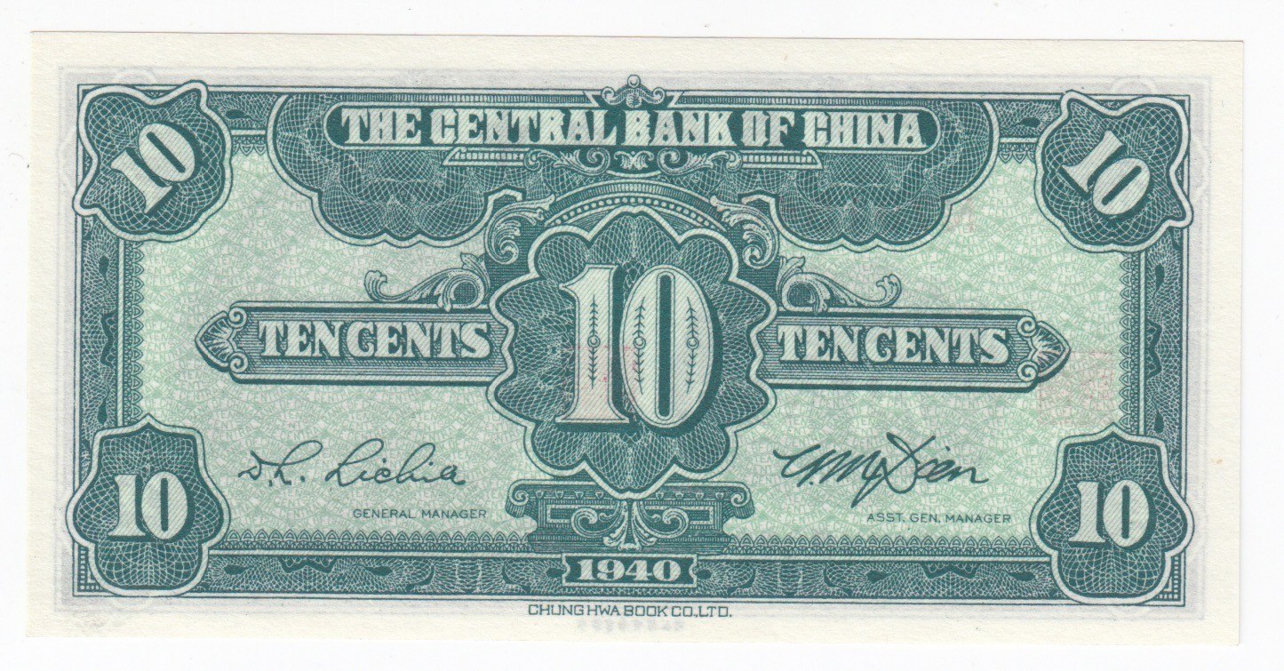 China (The Bank Central Bank of China) 10 Cents 1940