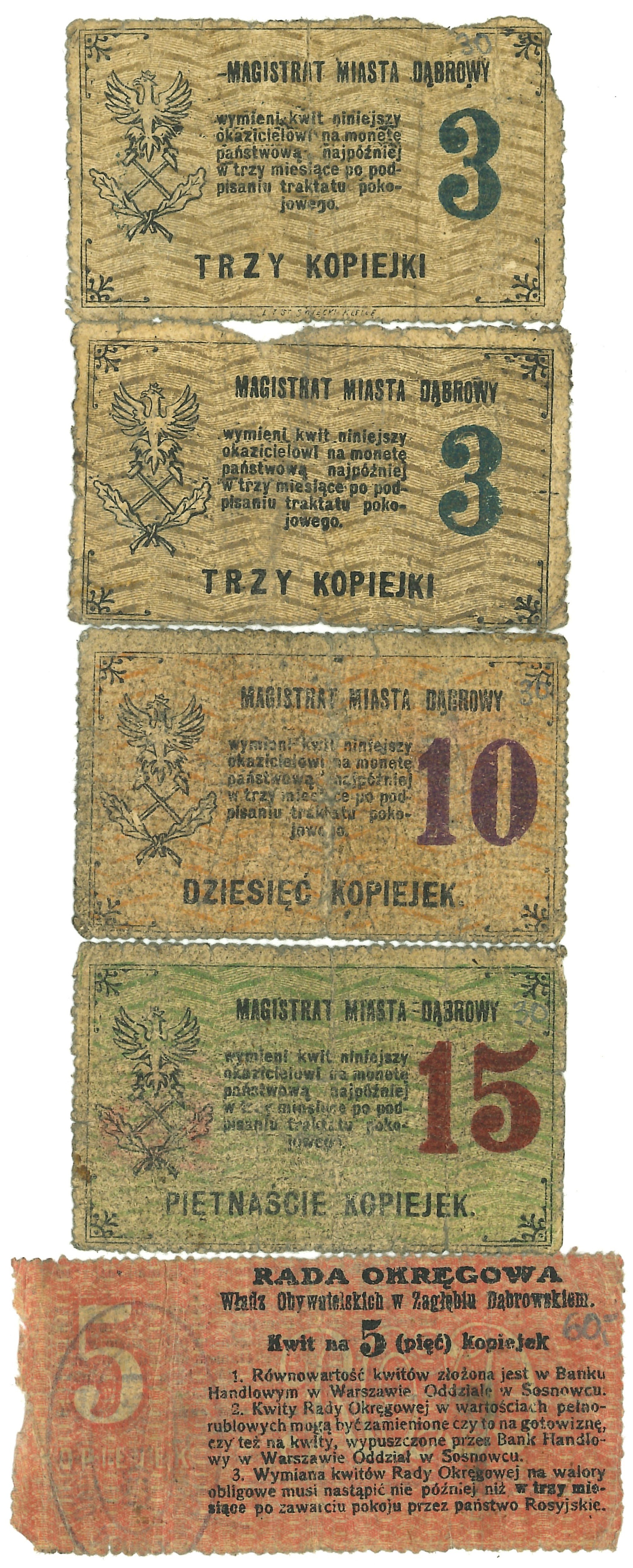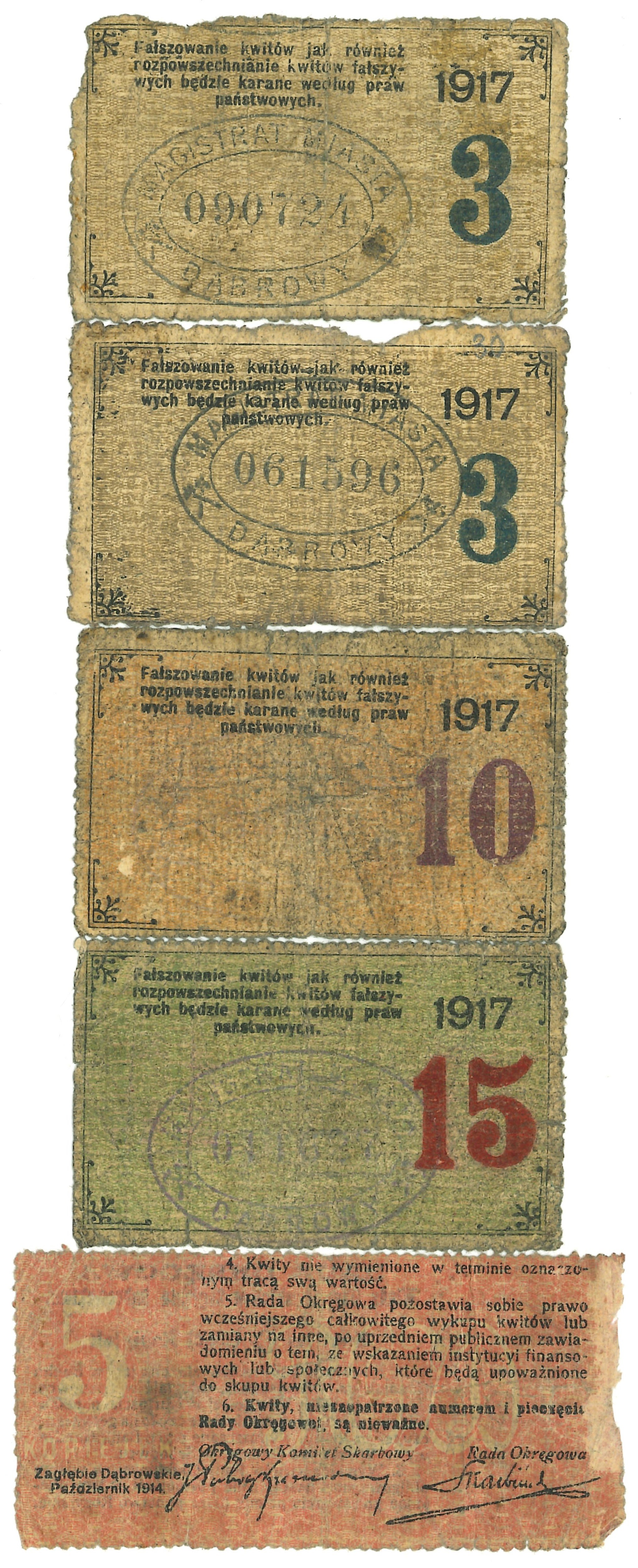 Zestaw banknotów zastępczych Magistratu Miasta Dąbrowy.