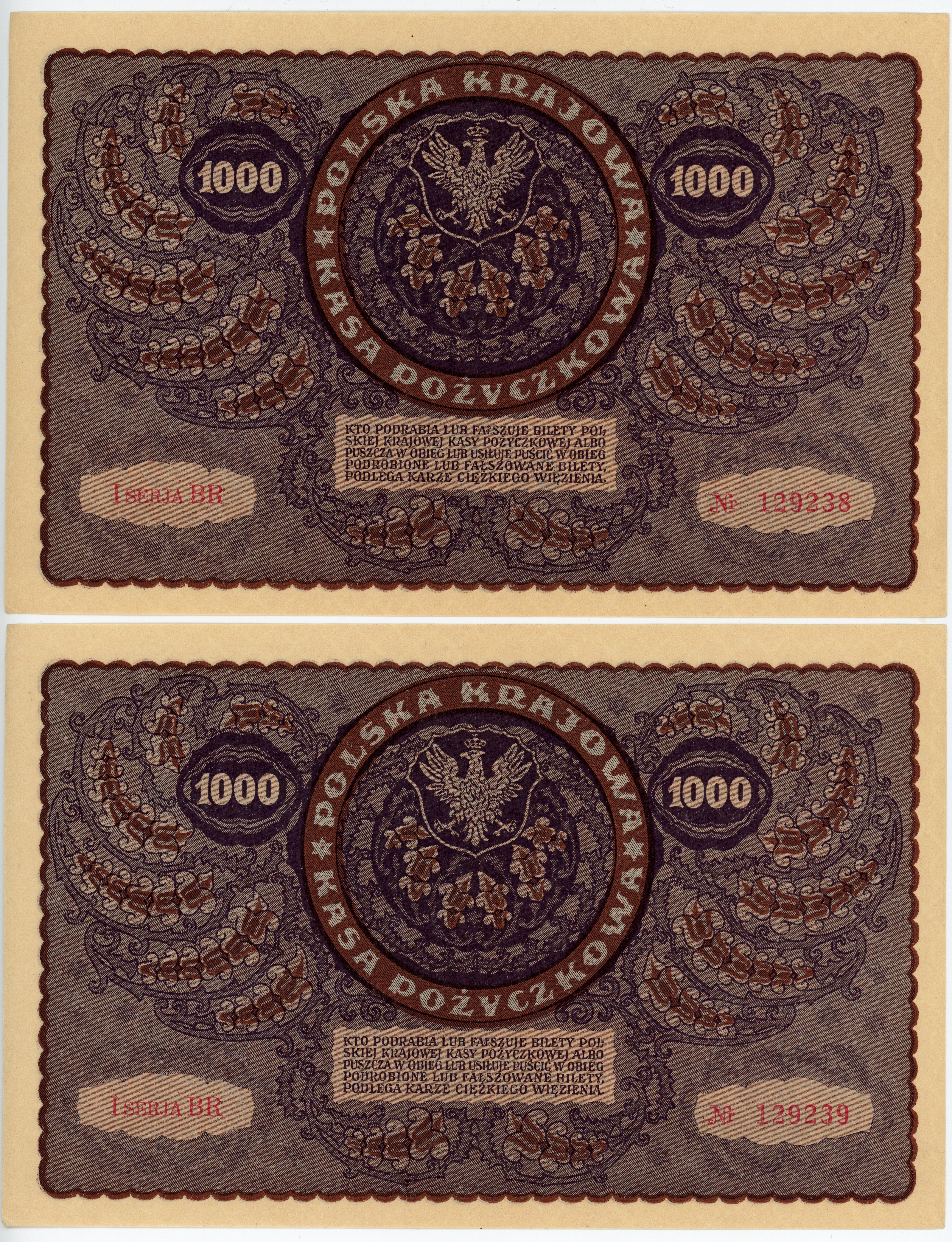 1.000 marek polskich 1919 - I seria BR zestaw 2 sztuk z kolejnymi numerami seryjnymi