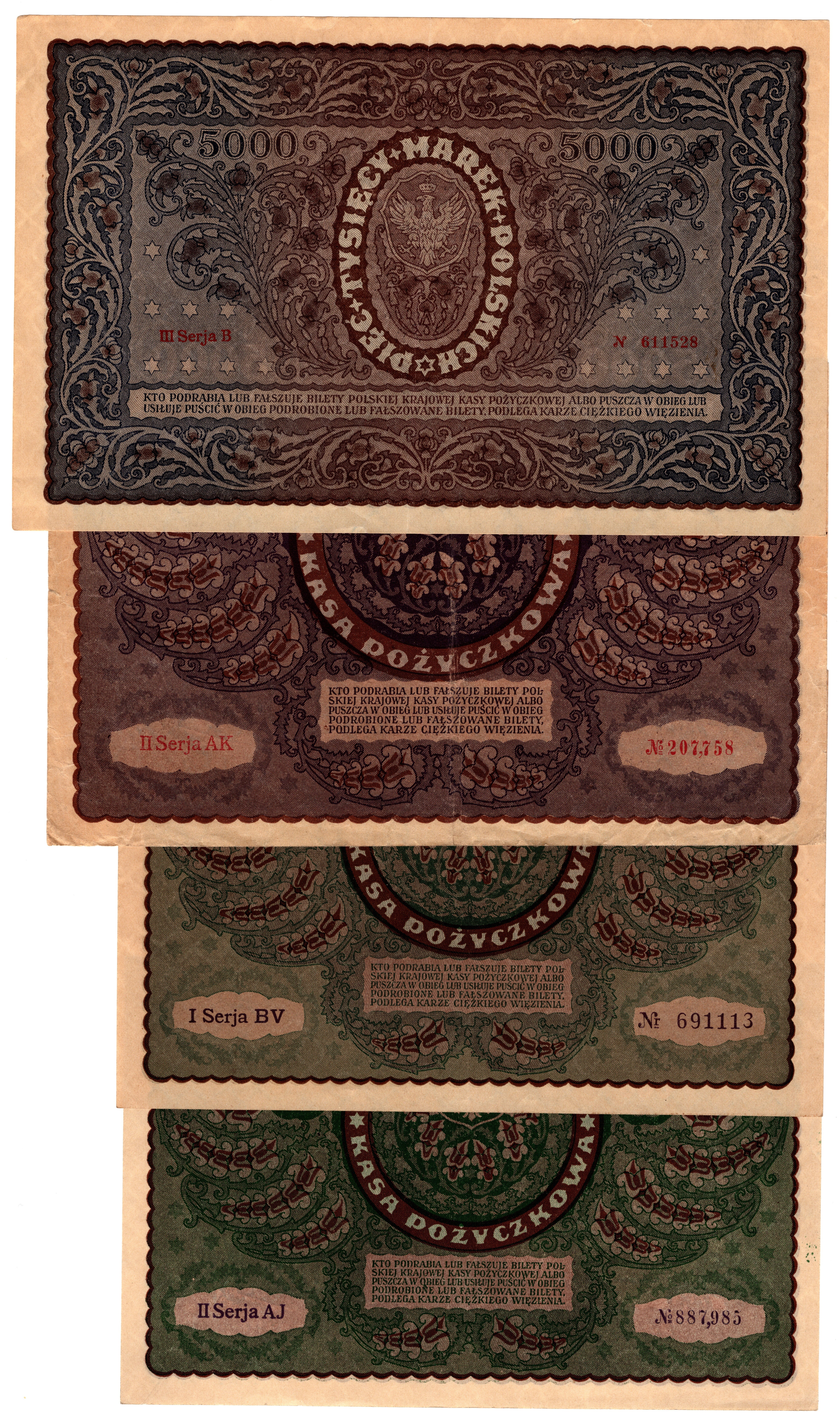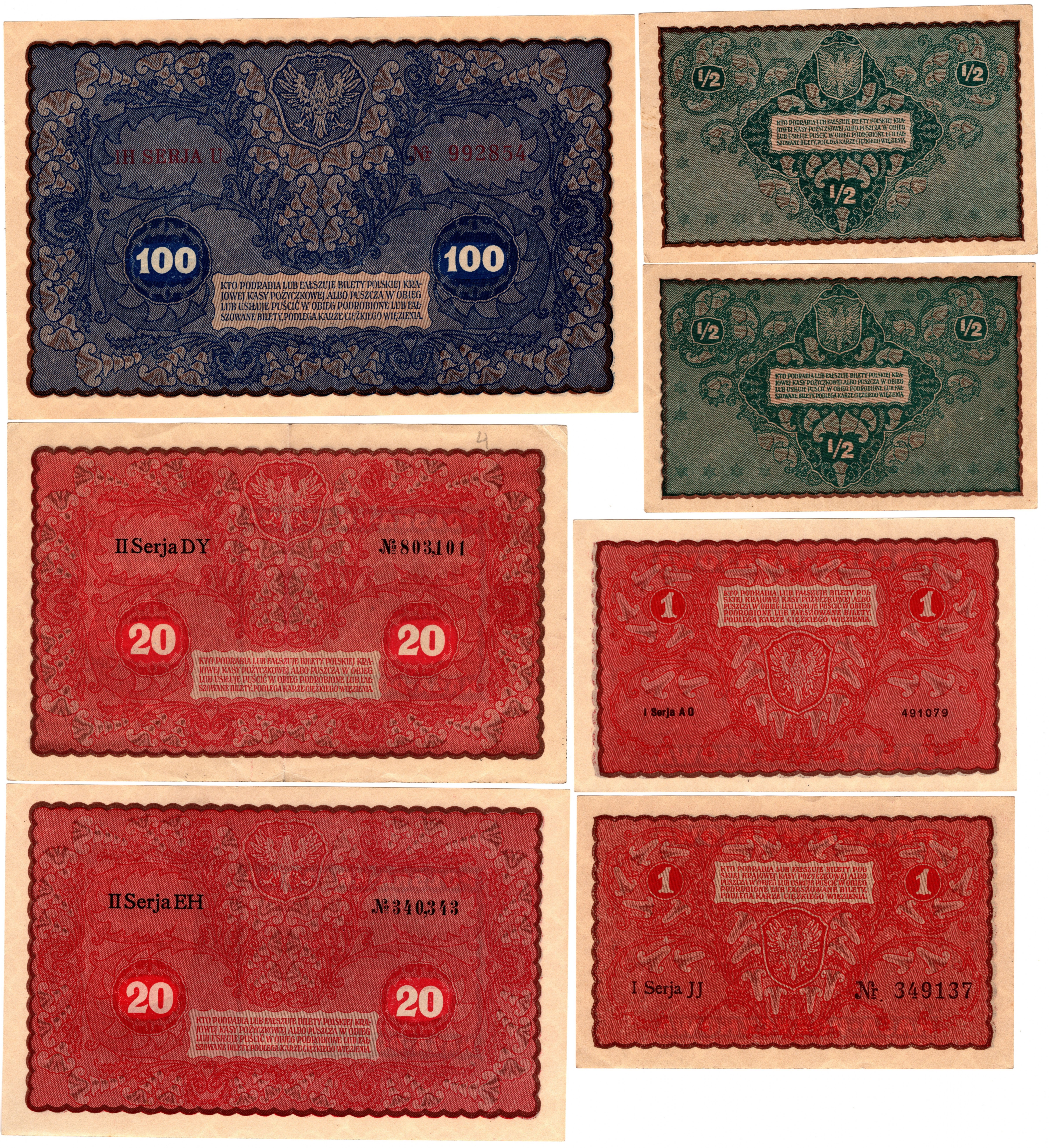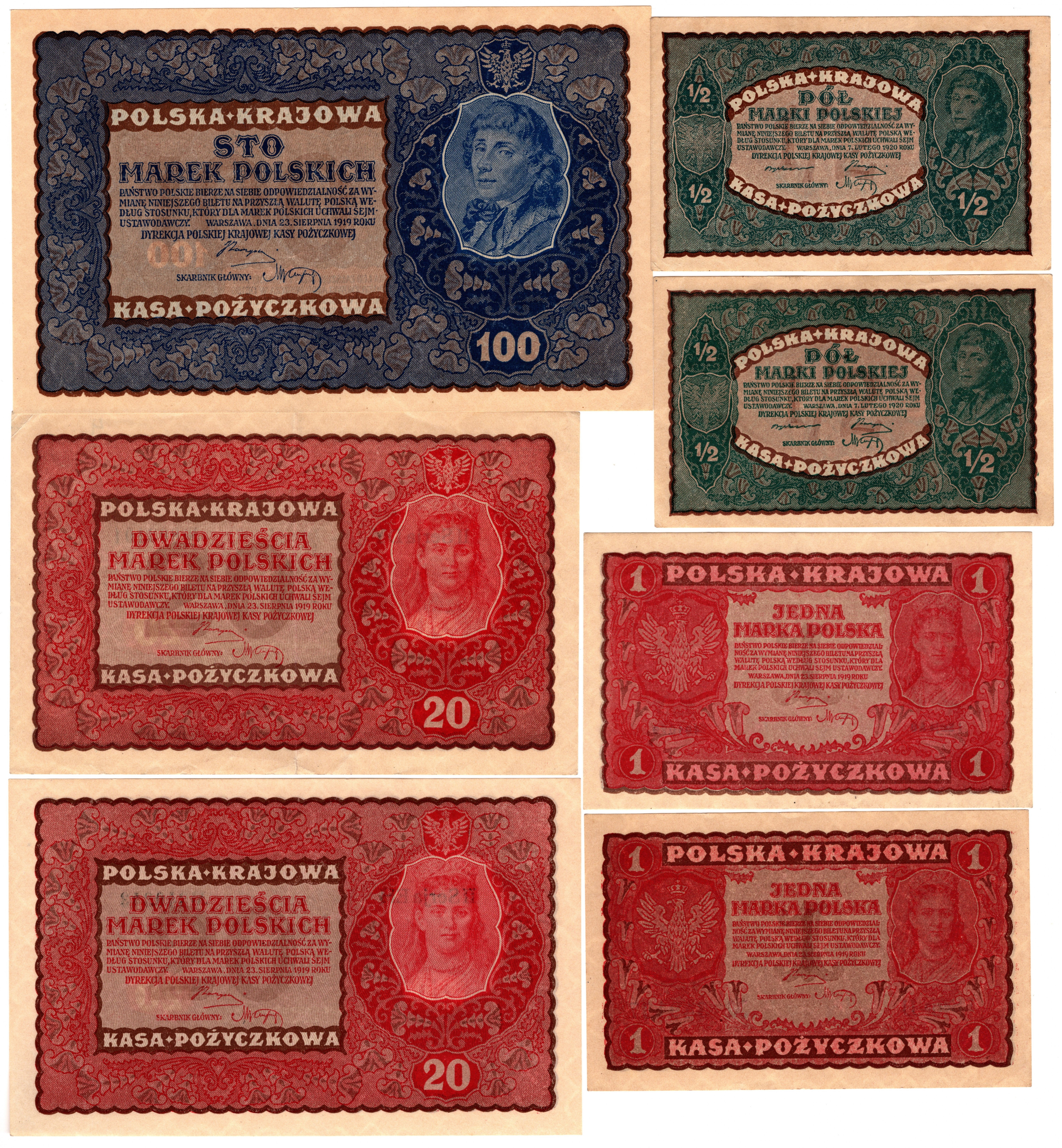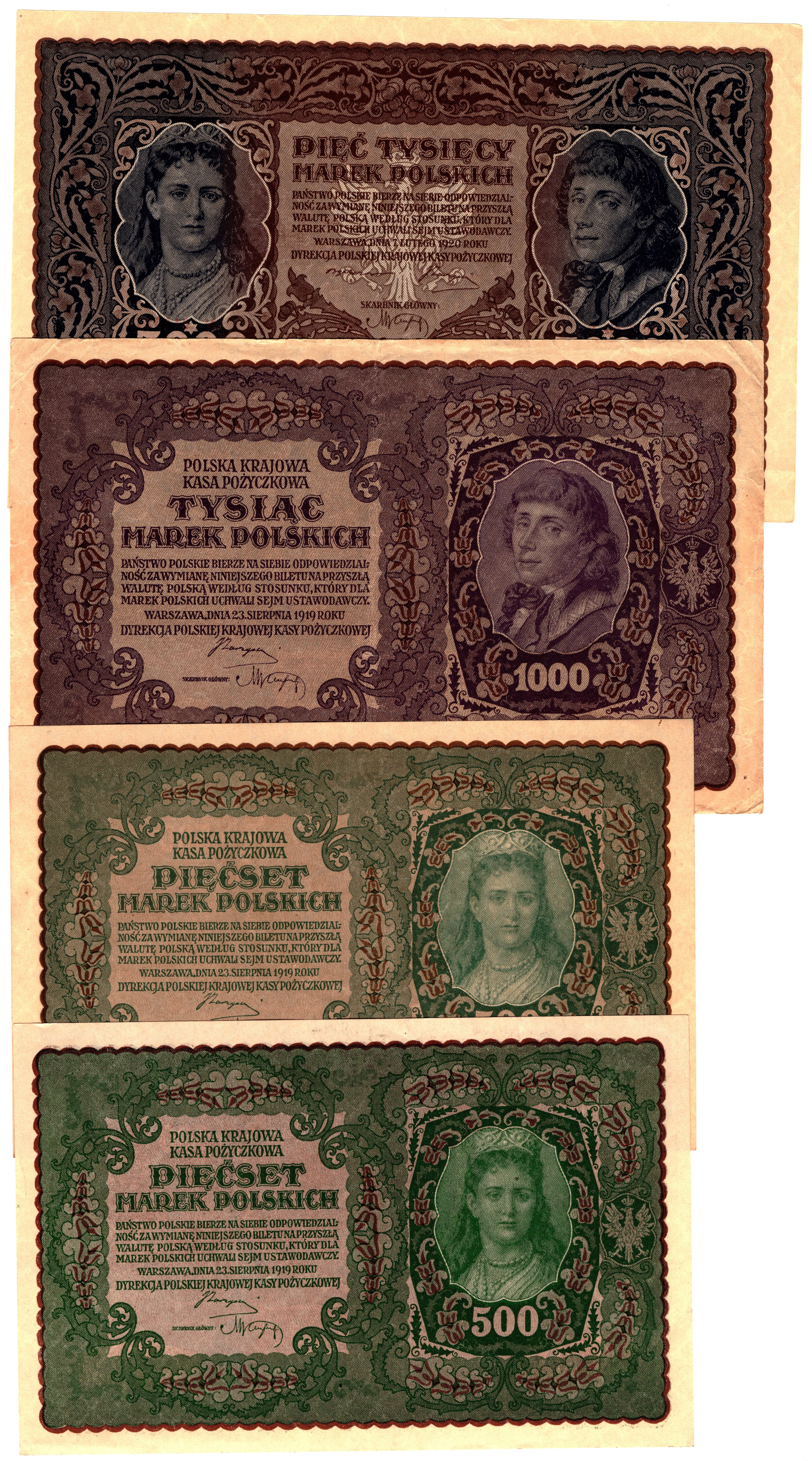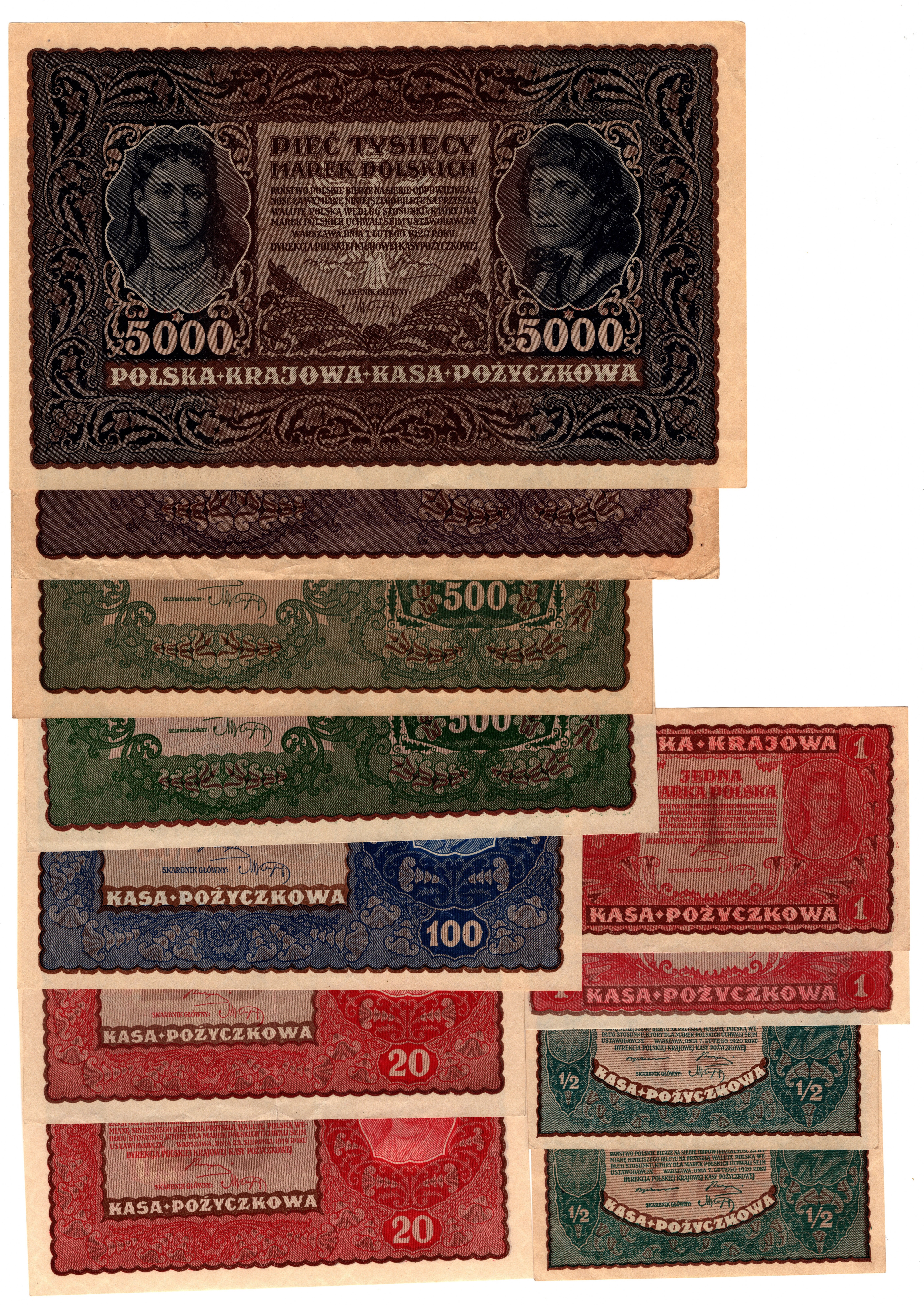 1/2 do 5.000 marek polskich 1919 r - zestaw 10 sztuk banknotów