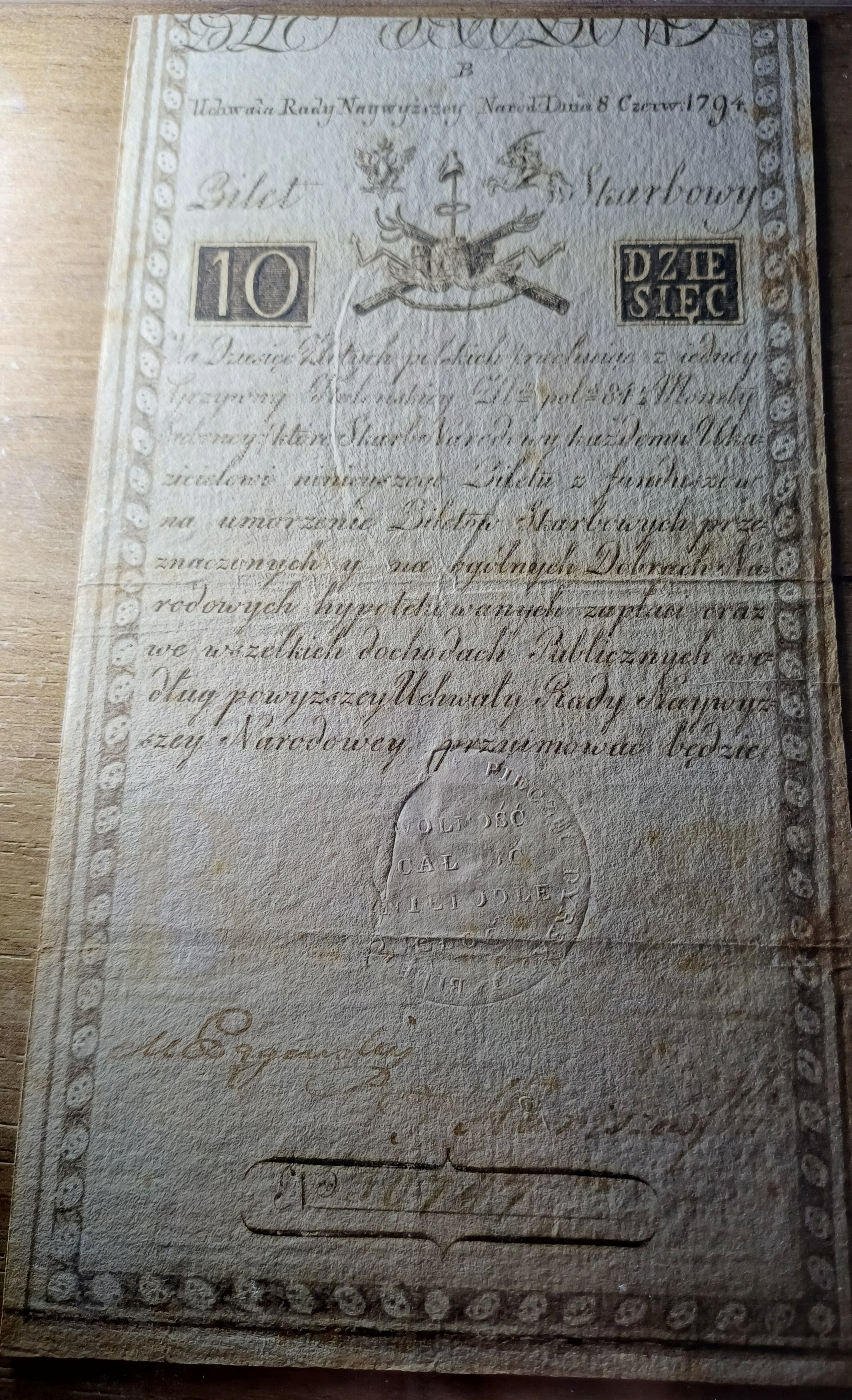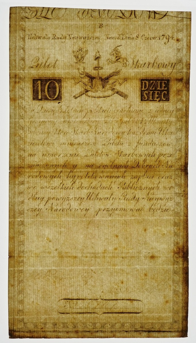 Bilet skarbowy Insurekcji Kościuszkowskiej 10 złotych 1794, serii B i numeracji 5-cyfrowej: 30747