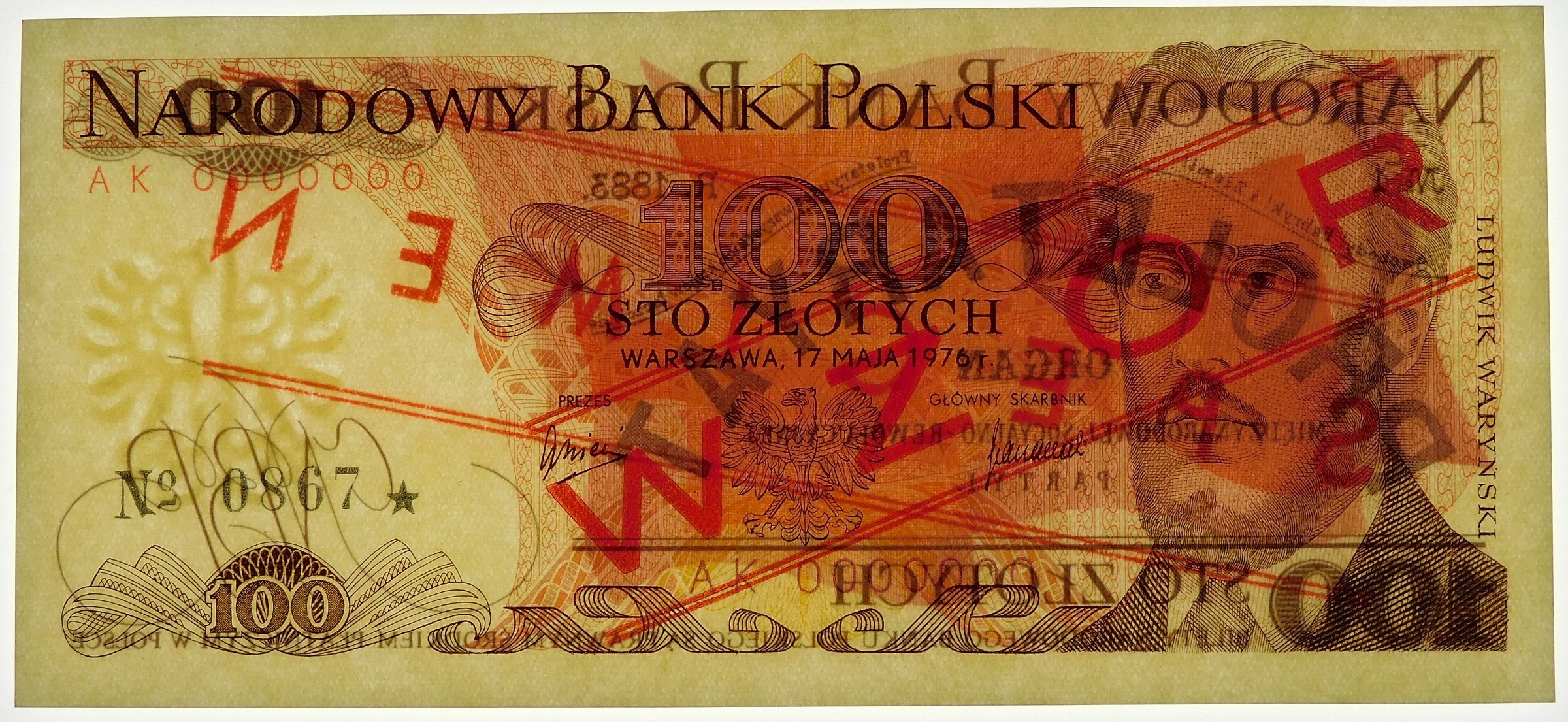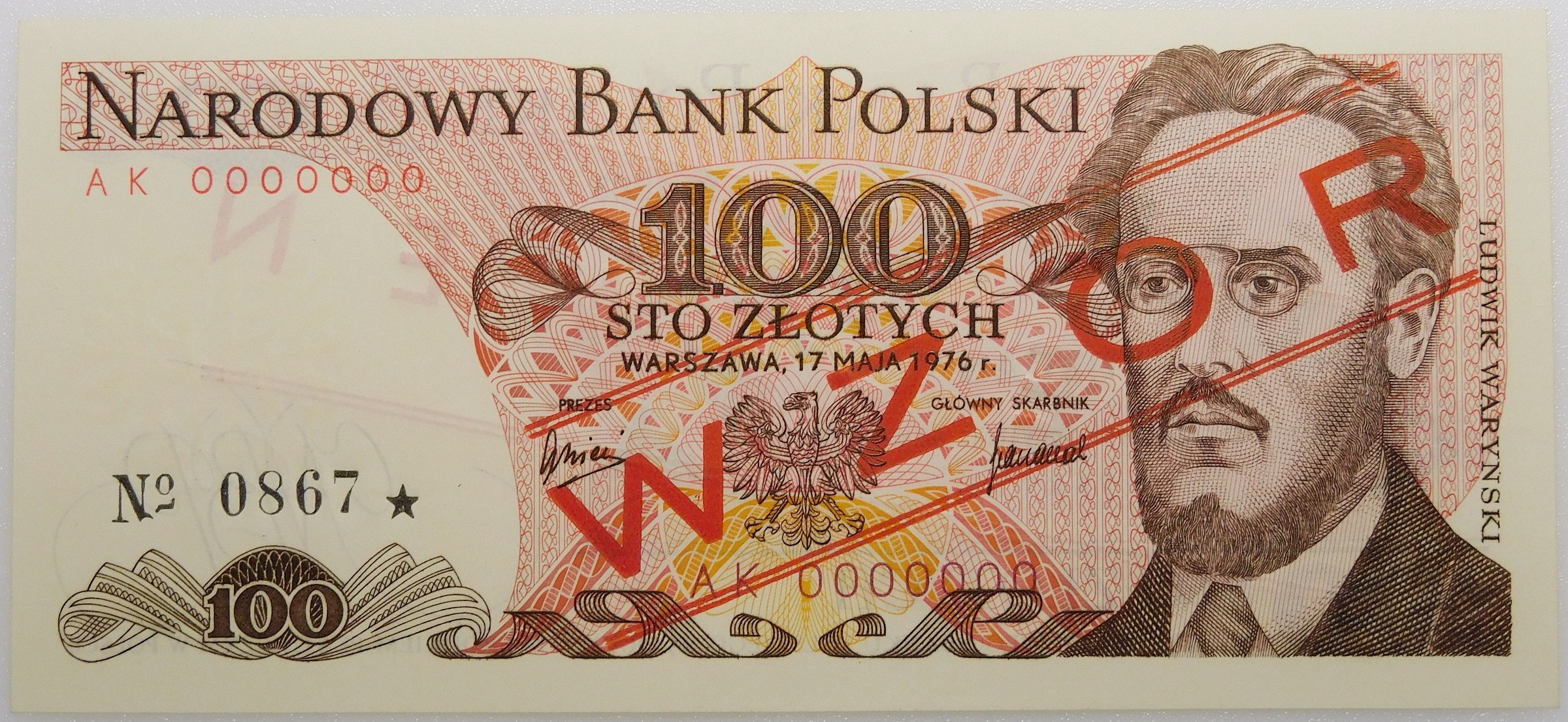 Banknot 100 złotych 1976 WZÓR, ser. AK numeracja zerowa: 0000000 - nr nakładowy wzoru: 0867★