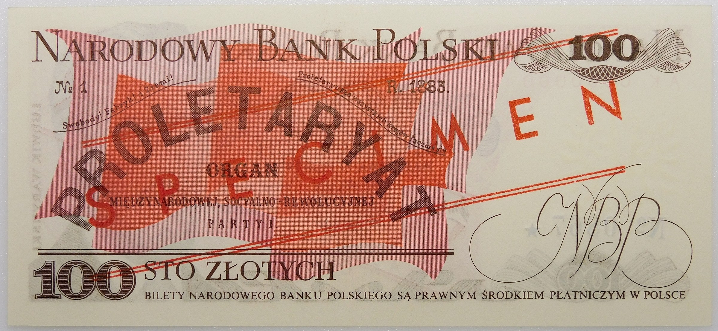 Banknot z ukośnymi nadrukami pomiędzy dwoma równoległymi liniami - na awersie WZÓR, a na rewersie SPECIMEN, nadruki w kolorze czerwonym. Na awersie, w kol. czarnym nadruk nr nakładowego wzoru.