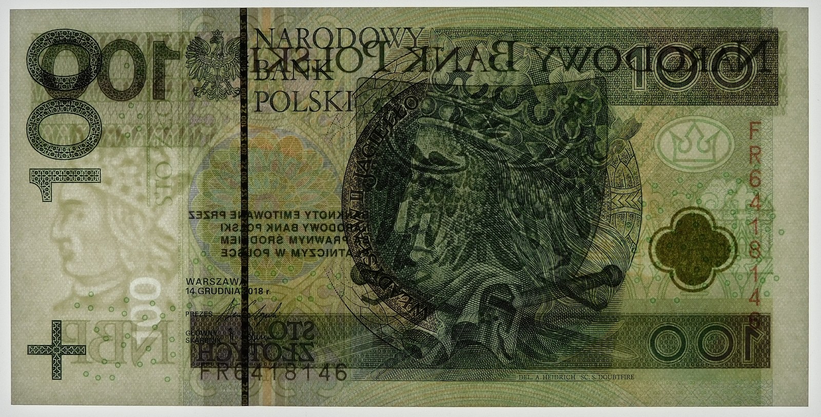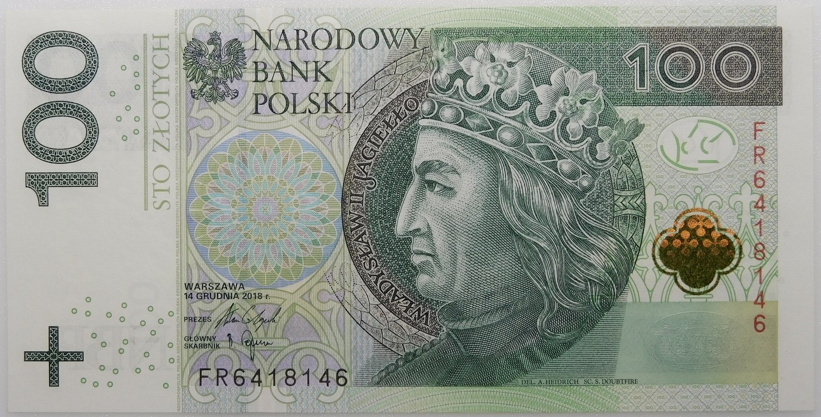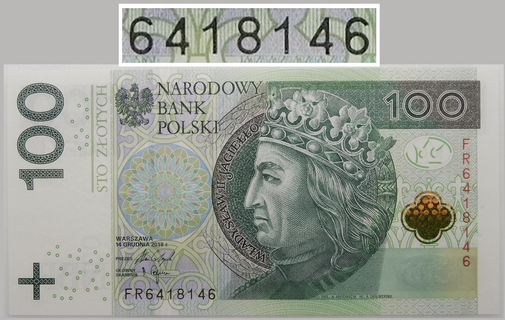 Banknot 100 złotych 2018, ser. FR - numeracja radarowa 6418146