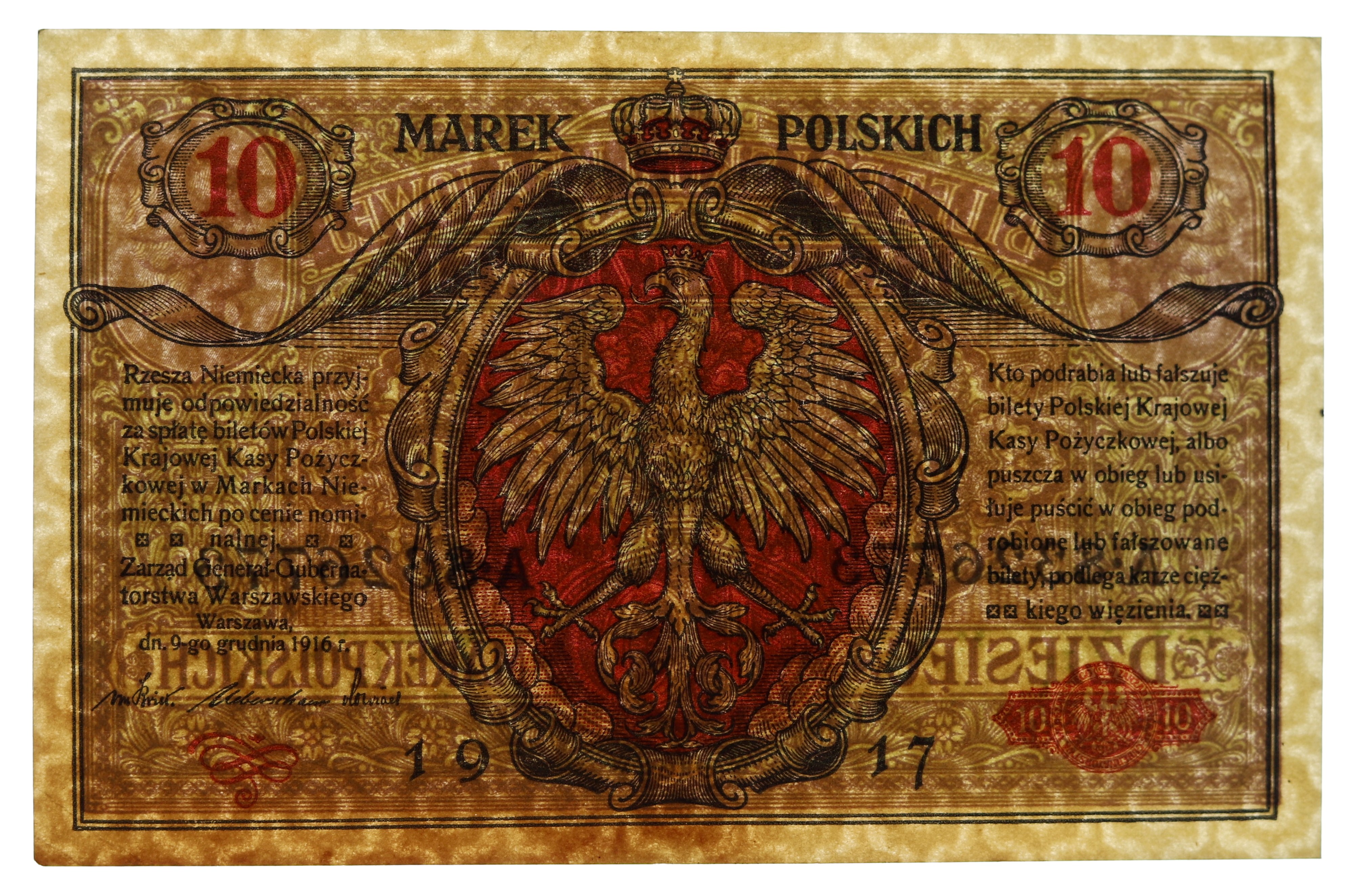 Banknoty Generalnego Gubernatorstwa wprowadzono do obiegu 26 kwietnia 1917, za emisję ich odpowiadała Polska Krajowa Kasa Pożyczkowa.