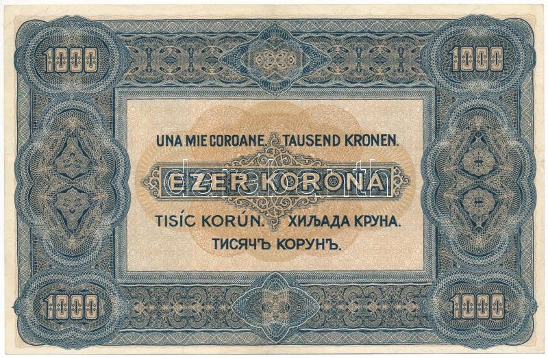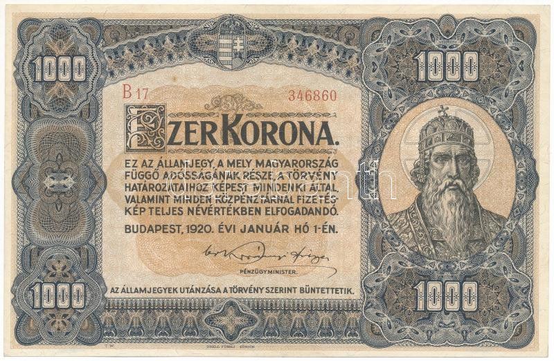 1920. 1000K "Orell Füssli Zürich" nyomdahely-jelöléssel, "B17 346860" sorszámmal T:F, szép papír, pici folt / Hungary 1920. 1000 Korona with "Orell Füssli Zürich" printer's mark, with "B17 346860" serial number C:F, fine paper, tiny spot Adamo K36, Krause P#66