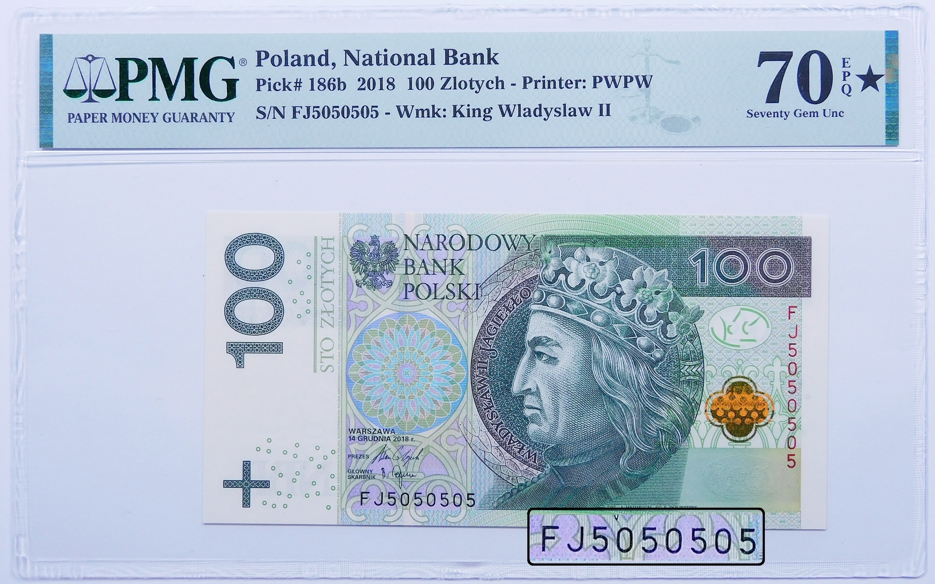 Wyjątkowo atrakcyjny egzemplarz, bo poza ciekawą numeracją, potwierdzony najwyższą maksymalnie możliwą notą gradingową PMG 70, z adnotacją EPQ świadcząca o wyjątkowej jakości papieru z * i jest to jak na razie jeden z dwóch odnotowanych egzemplarzy w rejestrze PMG.