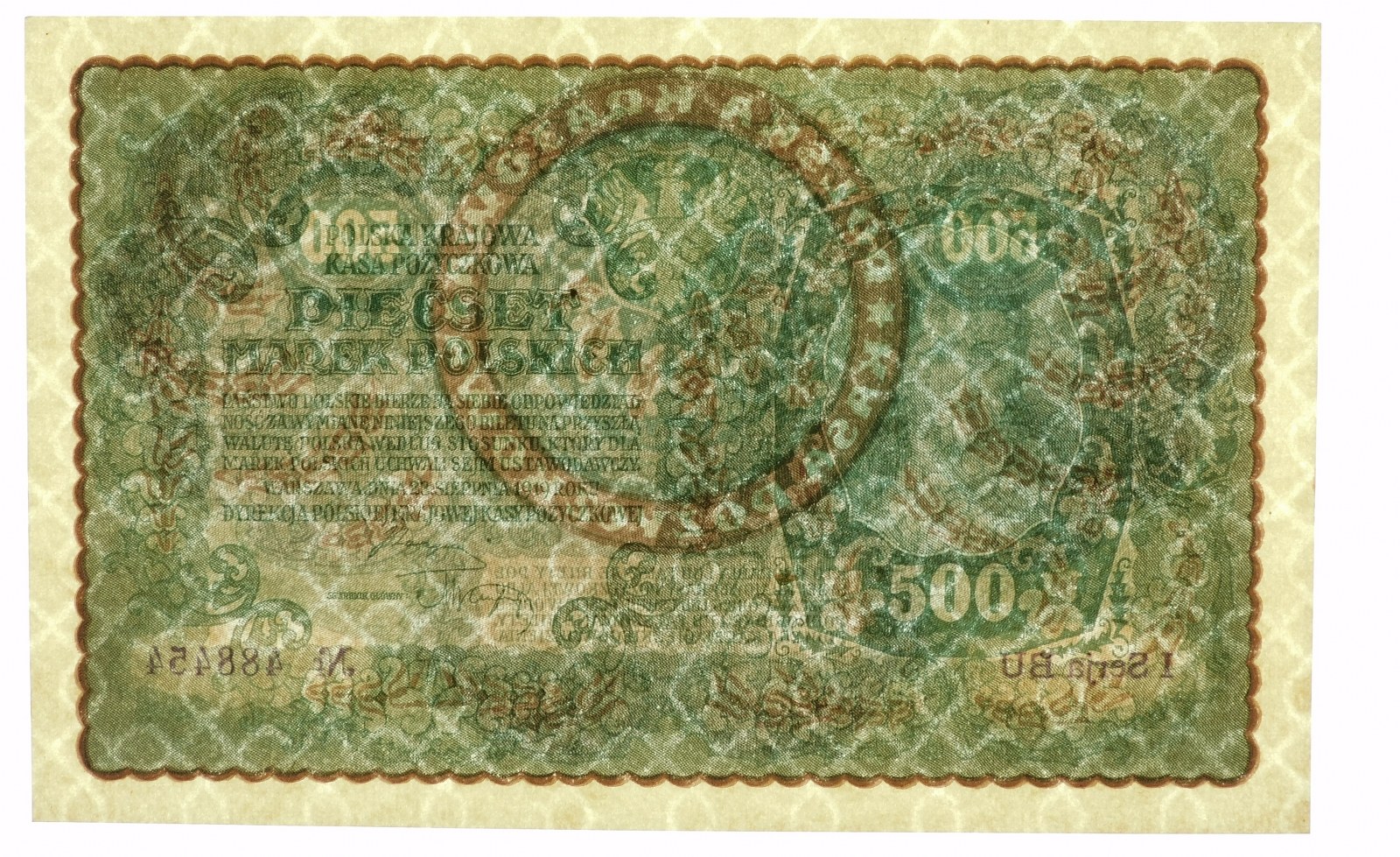 Banknot 500 marek polskich 1919, serii: I Serja BU , tzw. emisji wiedeńskiej.
