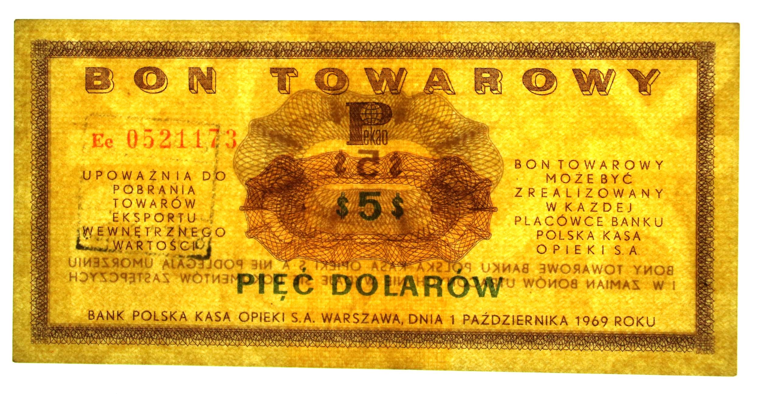 Pewex, 5 dolarów 1969 Ee. Stan zachowania 2+. Bardzo słabe ugięcie pionowe, prawie niedostrzegalne i niewidoczne w świetle przechodzącym. Słabe złamanie lewego górnego rogu nie wychodzące za margines. Literatura: Miłczak B19a