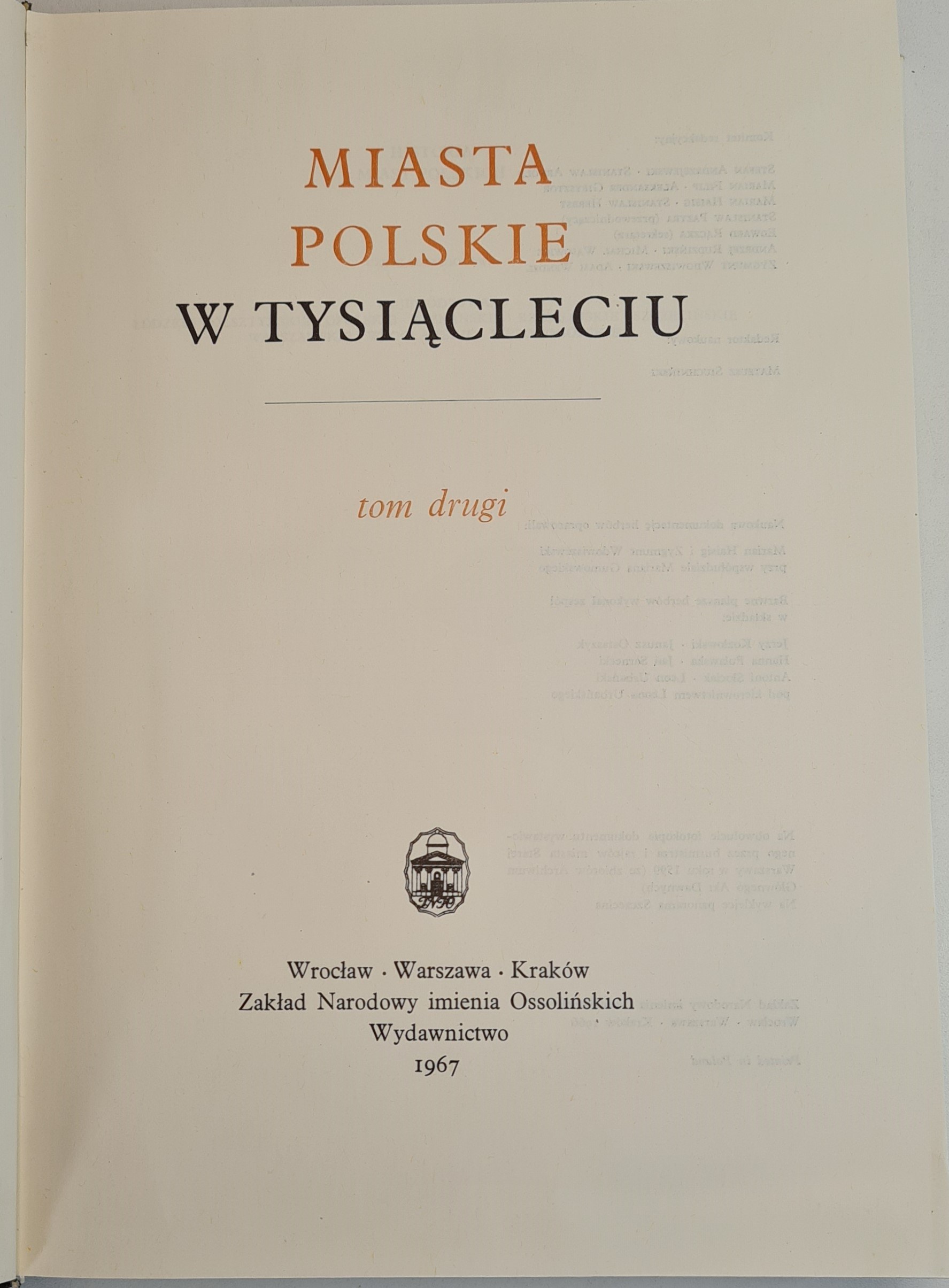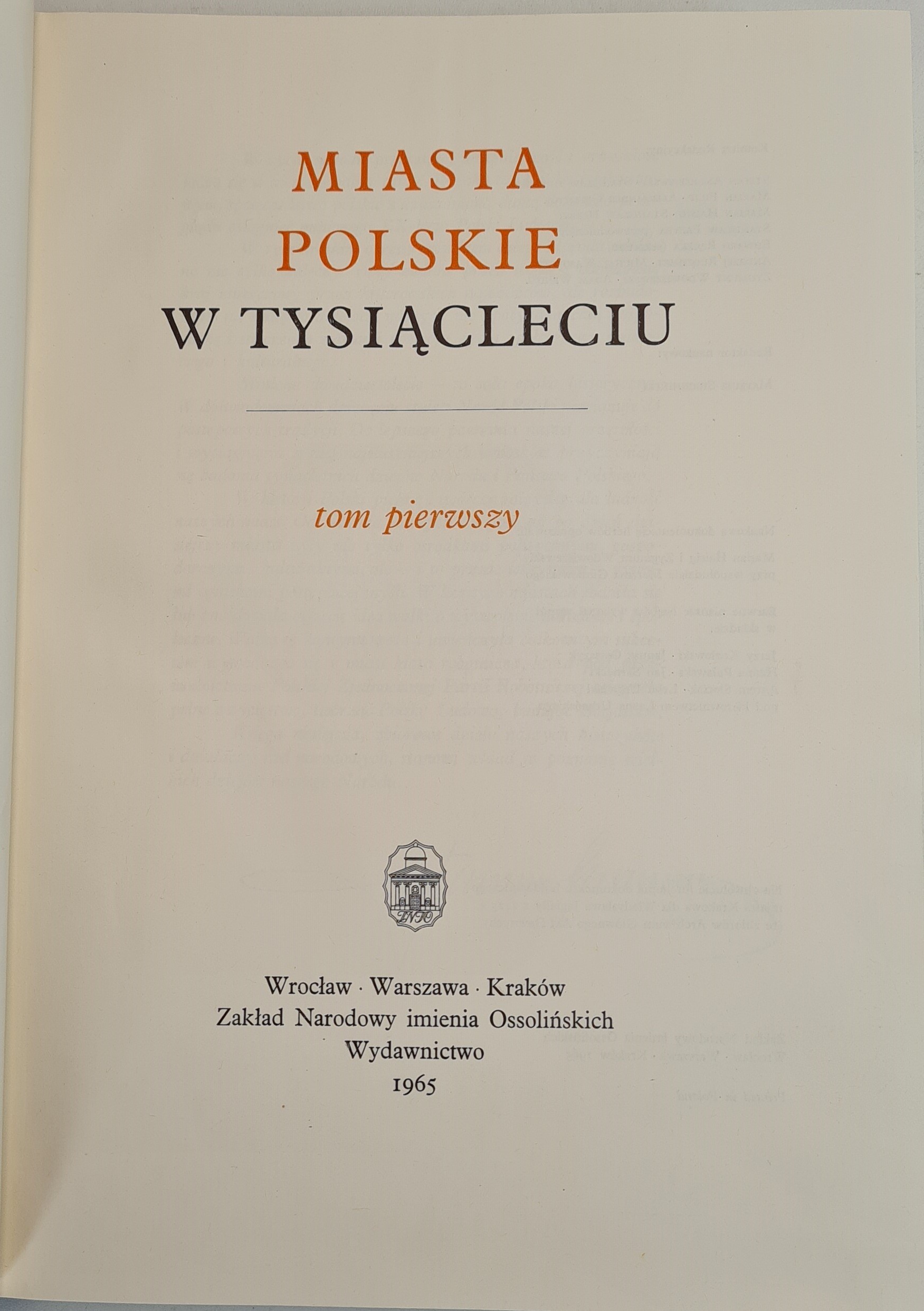 "Miasta polskie w tysiącleciu" to dwutomowa polska encyklopedia historyczno-geograficzna wydana na uczczenie 1000-lecia państwa polskiego, pokazująca historię poszczególnych miast i województw leżących w Polsce. "Publikację opracował 25-osobowy zespół redakcyjny związany z Zakładem Narodowym im. Ossolińskich. Redaktorem naukowym wydawnictwa był Mateusz Siuchniński. Przewodniczącym redakcji był Stanisław Pazyra, a sekretarzem Edward Rączka. W komitecie redakcyjnym zasiadali: Stefan Andrzejewski, Stanisław Arnold, Marian Filip, Aleksander Gieysztor, Marian Haisig, Stanisław Herbst, Andrzej Rudziński, Michał Wąsowicz, Adam Wendel. Dokumentację naukową herbów opracowali: Marian Haisig, Zygmunt Wdowiszewski, Marian Gumowski. Barwne plansze z herbami pod kierownictwem Leona Urbańskiego wykonał zespół: Jerzy Kozłowski, Janusz Ostaszyk, Hanna Puławska, Jan Sarnecki, Antoni Słociak" [Wikipedia].