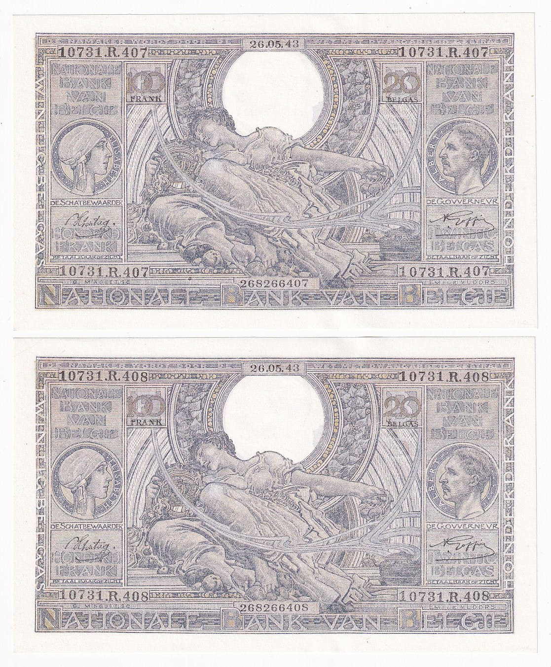 Belgium 2 x 100 Francs / 20 Belgas 1943 With consecutive numbers