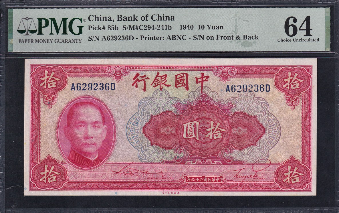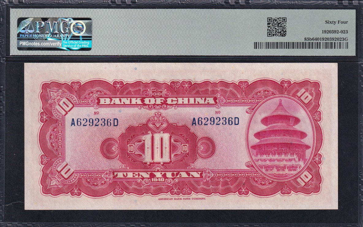 China, Bank of China, 10 Yuan, 1940, Choice UNC 64, Pick: 85b