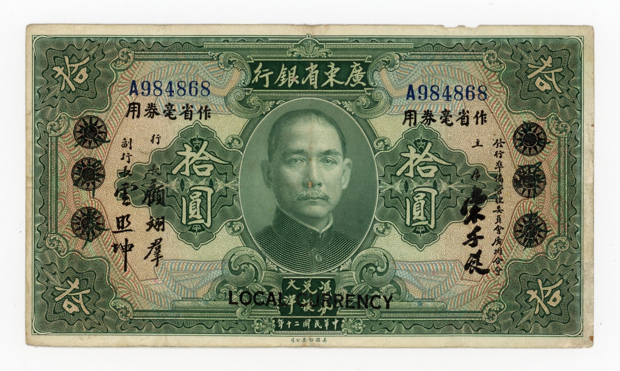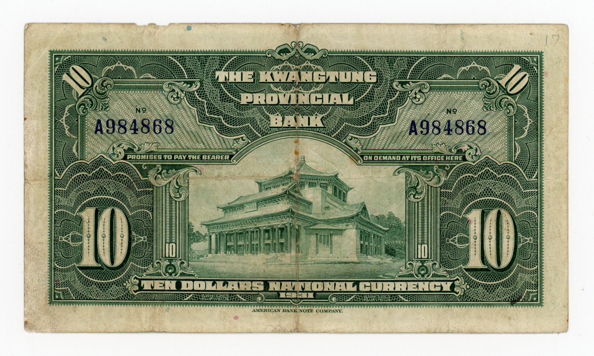 Chiny, Kwangtung, 10 dolarów 1931. Stan zachowania 3-. Kilkukrotnie złamane. Literatura: Pick S2429b