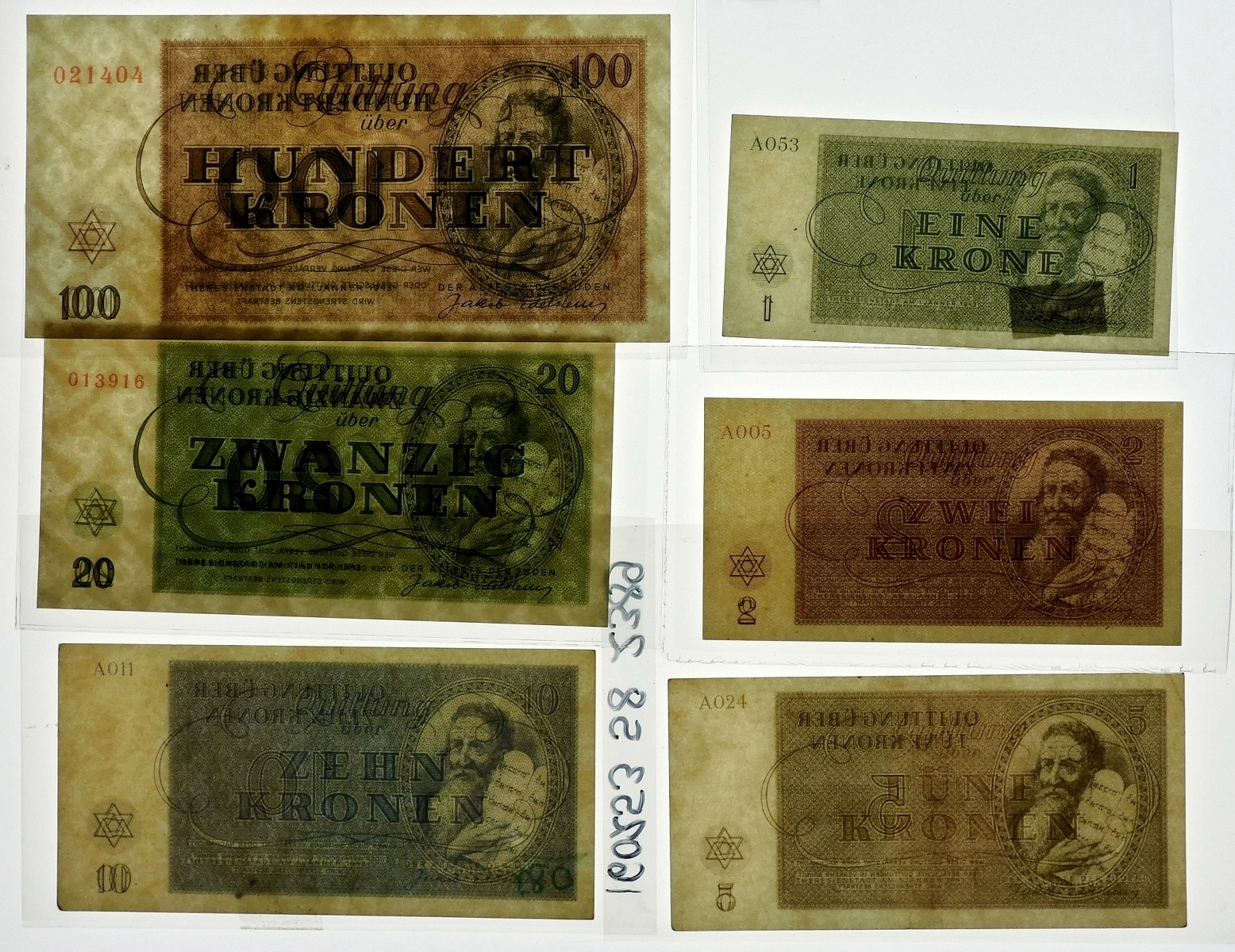 Czechosłowacja - zestaw - Getto Terezin - 1, 2, 5, 10, 20, 100 koron 1943 r.